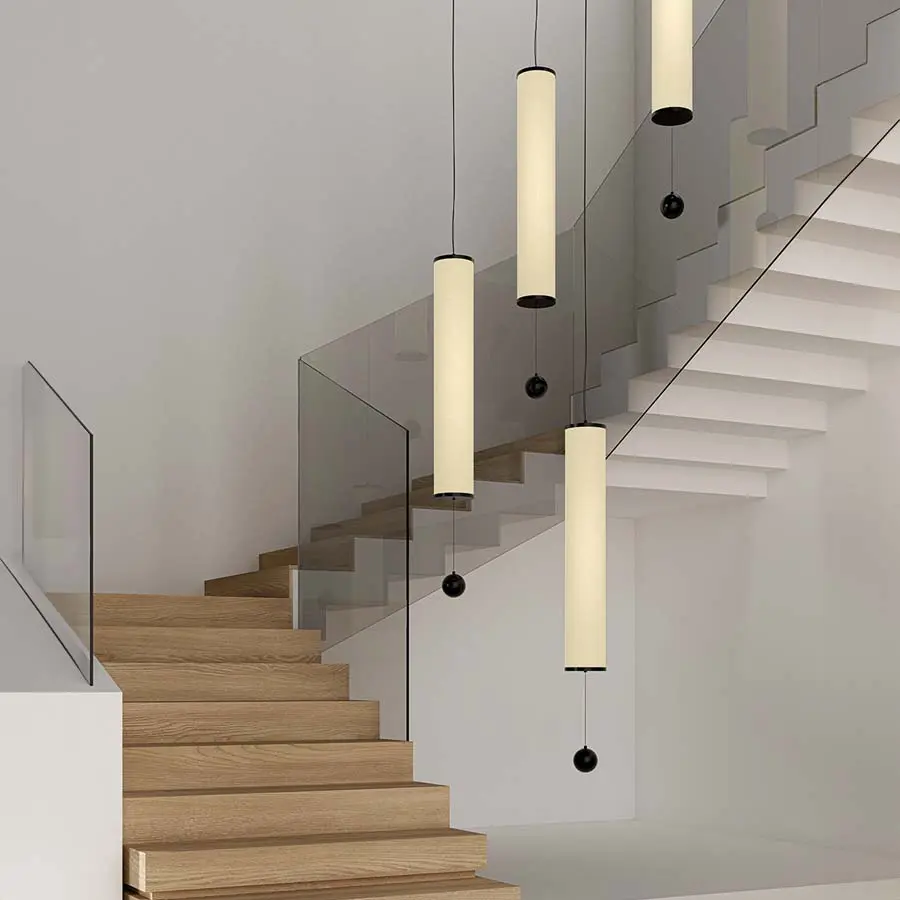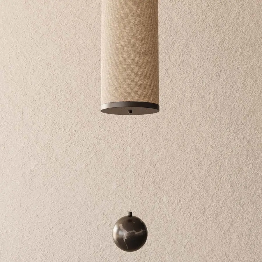 La lámpara colgante Nooi se puede instalar en posición vertical o horizontal. La posición vertical y horizontal de la lámpara se puede configurar con un único elemento. Es regulable en intensidad y se puede fabricar en diferentes acabados. Los extremos metálicos sostienen la tulipa de lino. En la versión vertical cuelga una elegante bola de mármol o metal.