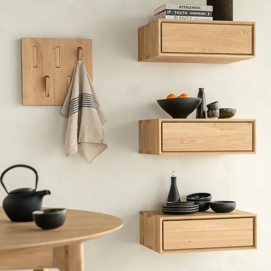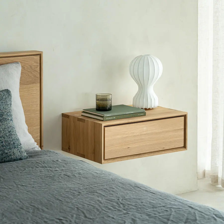 Inspirada en nuestra gama nórdica, la mesita de noche nórdica combina líneas elegantes con la pureza de la madera maciza en una forma pequeña y elegante. Esta versión colgante debe estar fijada a la pared. Cuenta con un cajón de apertura Push.