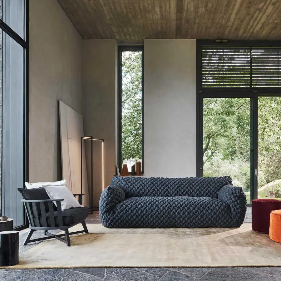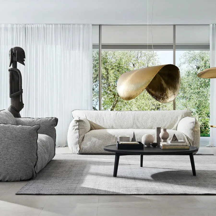 Familia de sofás con formas suaves y atractivas, Nuvola tiene una estética que invita a hundirse dentro: los brazos altos acogen un asiento tan profundo como un abrazo, creando un verdadero efecto cocoon. Disponibles de dos o tres plazas, tienen el relleno de poliuretano expandido con cotas diferenciadas revestido con acolchado de pluma de ganso y copos de fibra de poliéster. La funda es extraíble, con costuras a la vista que dibujan el perfil del producto, y puede realizarse con todas las fundas del catálogo, bajo el lema de la máxima versatilidad.