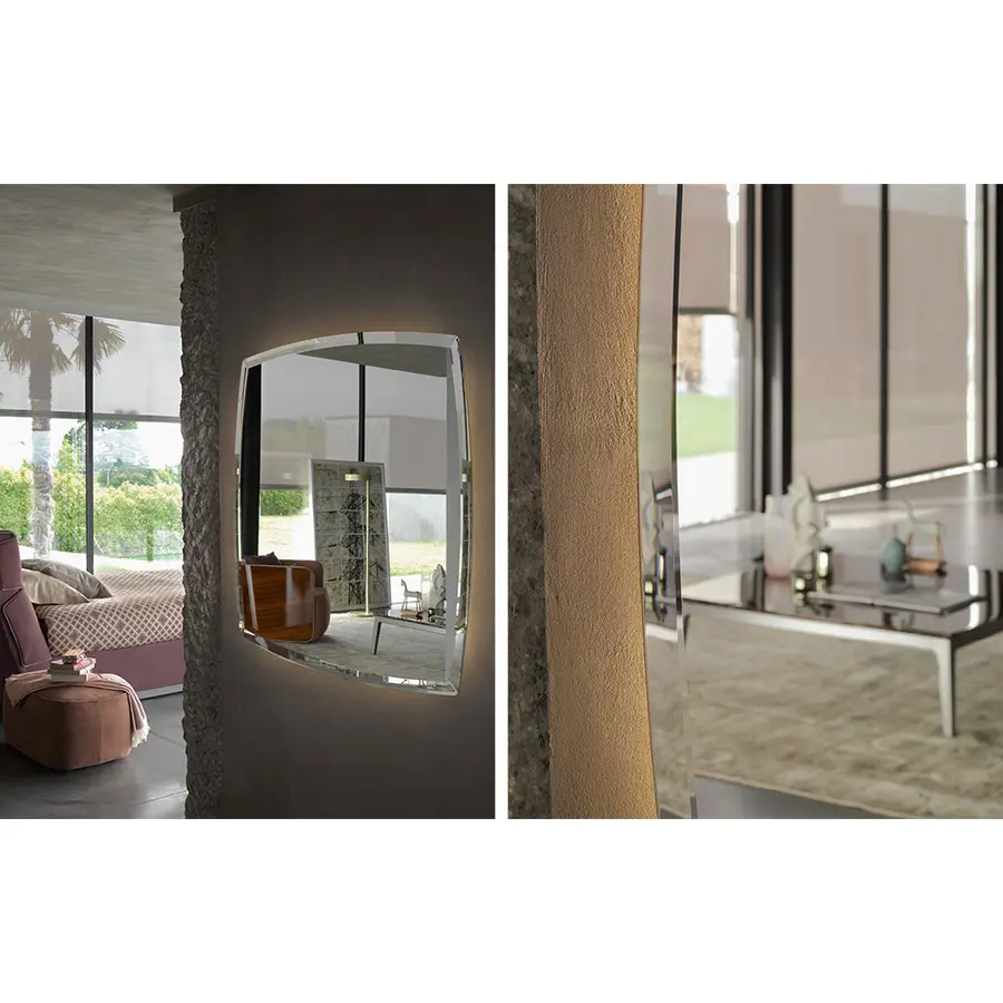 Serie de espejos disponibles en tres medidas diferentes, realizados en cristal biselado con marco de 4,5 cm, con acabado natural y ahumado. Disponible también en la versión con LED.
