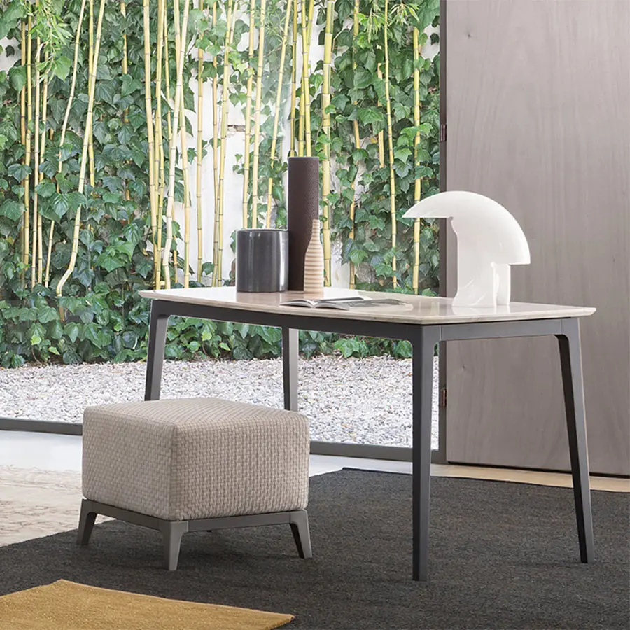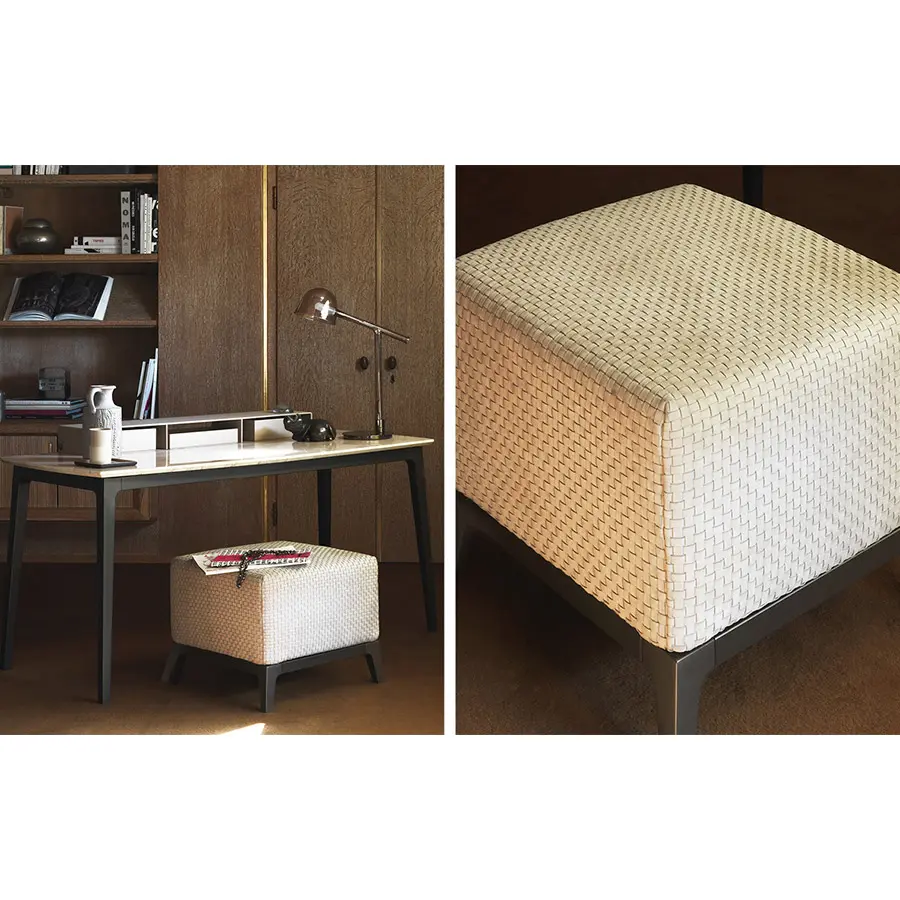 Banqueta y puf con estructura de tubular de acero bruñido cepillado. El asiento, suavemente acolchado, se puede revestir con piel con una elaboración trenzada o bien con tejido, Ecopelle o piel.