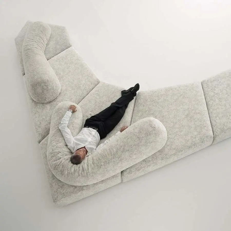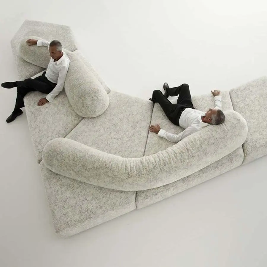 Amplio, sin estructuras rígidas, con cuatro elementos de asiento de diferentes formas y dos respaldos, separados de la base y de diferentes medidas que se pueden disponer como prefieras. Un sistema de secciones que te deja libertad para expresarte y que se puede personalizar tanto como quieras. Sus piezas geométricas se pueden realizar en diferentes soluciones: combinadas en una composición o todas independientes, para cambiar la perspectiva de una habitación.