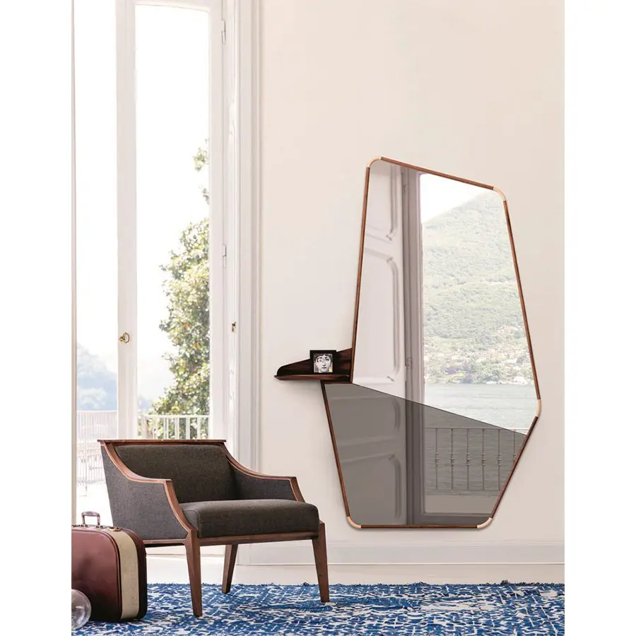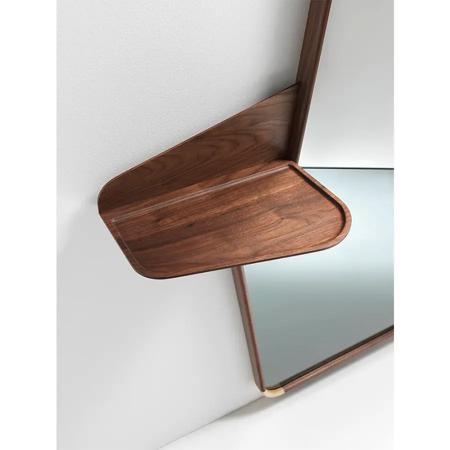 Espejo para apoyar a la pared con repisa en nogal canaletta macizo. Detalles en arce. Espejo natural en la parte superior y ahumado en la parte inferior.