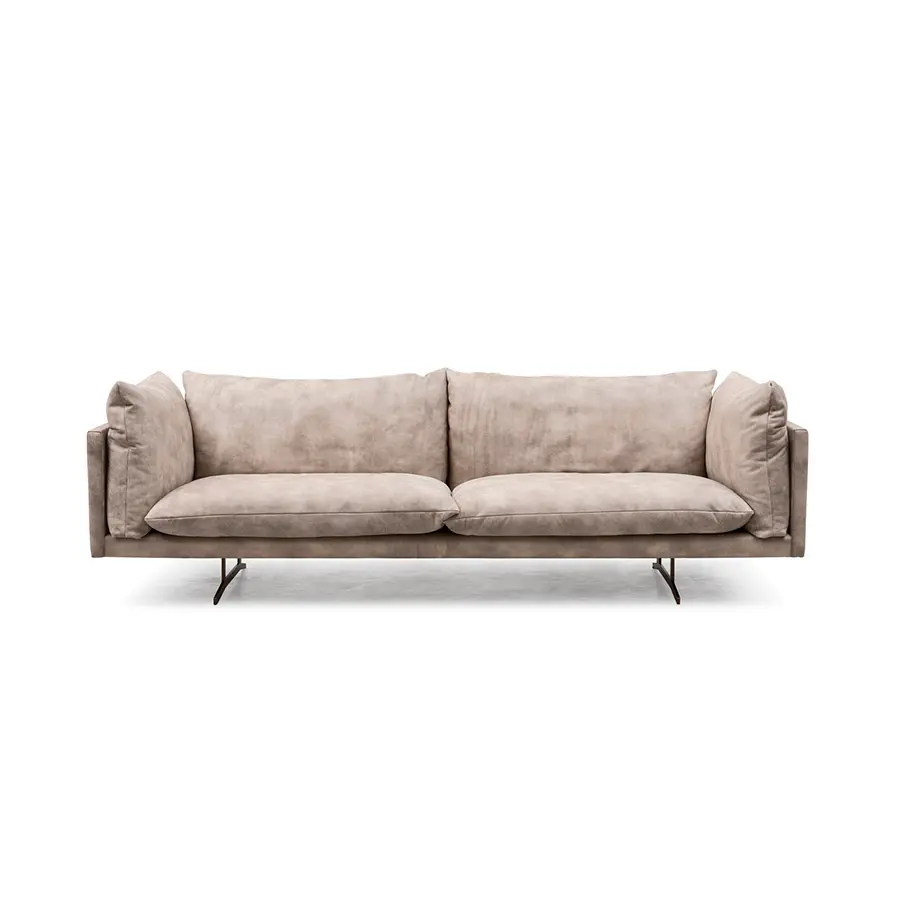 En el sofá Oslo, los mullidos rellenos se funden con la forma regular de la base y los reposabrazos. Oslo descansa con elegancia sobre patas de metal barnizado y está disponible en cinco anchos y dos variantes de sillón.