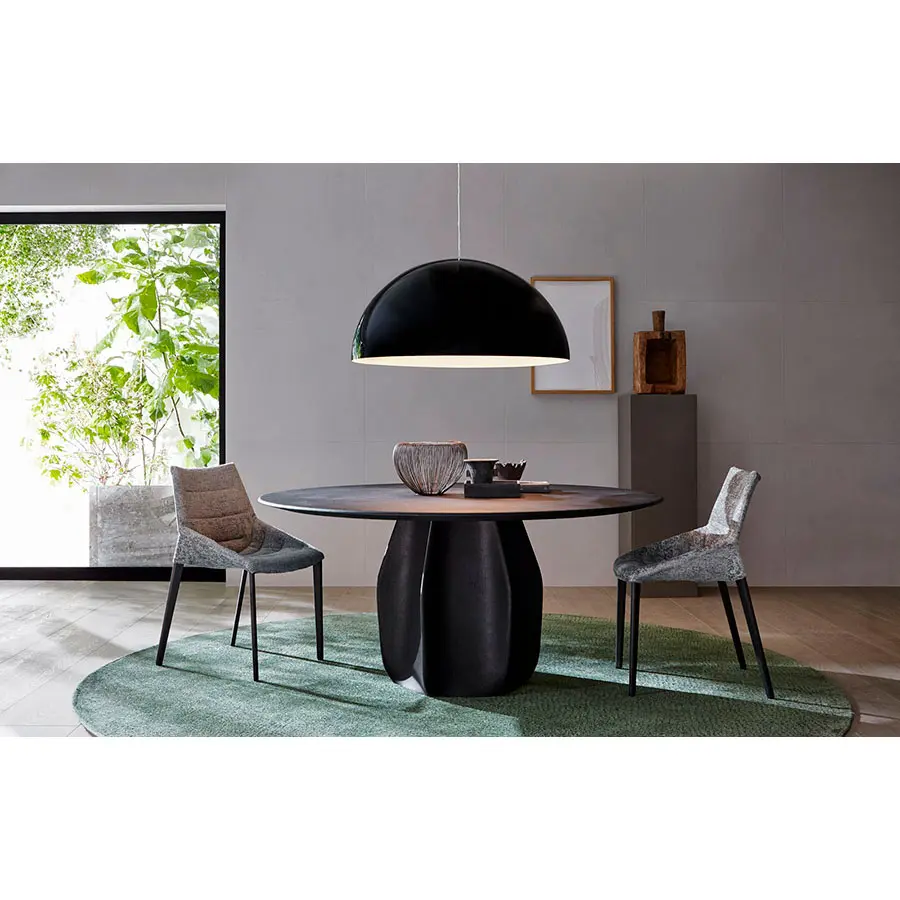 Silla tapizada en tela o piel completamente desenfundable. Las patas pueden ser metálicas- acabadas en peltro, cromo negro o zinc brillante- o bien en madera – acabadas en roble gris, grafito, o negro; eucalipto o nogal.