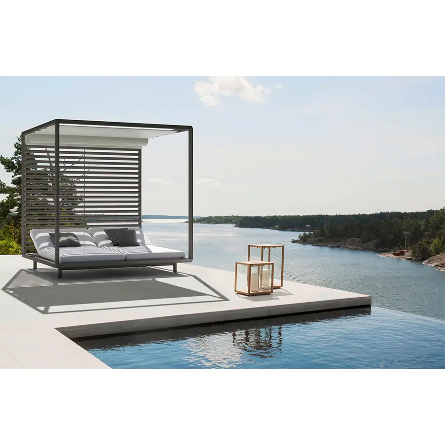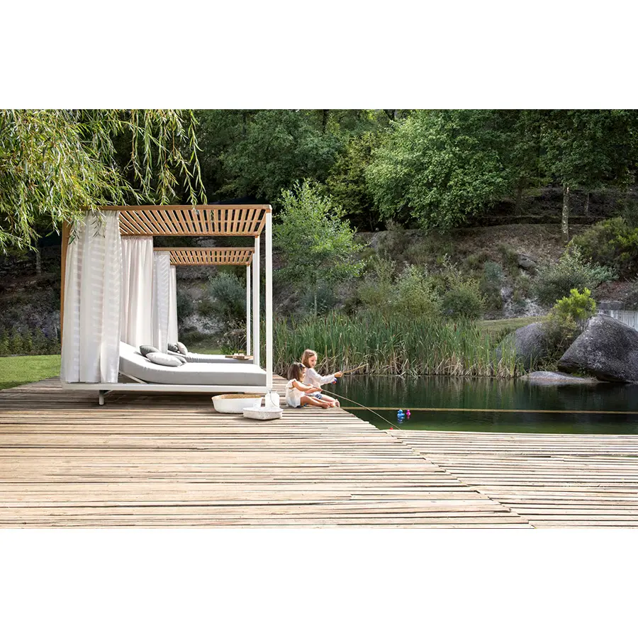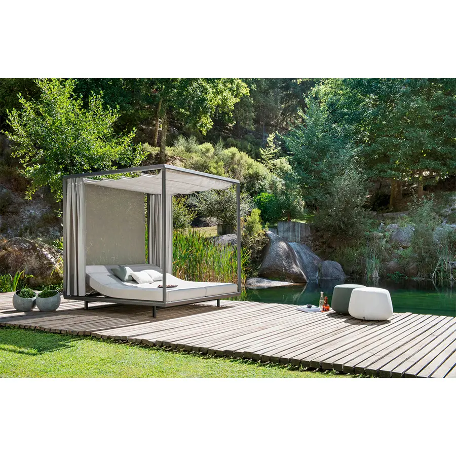 Monica Armani moderniza la clásica cama de columnas, dándole una silueta geométrica en aluminio con lacado en polvo. El sofá cama se puede configurar completamente a su gusto. Así, por ejemplo, puede elegir el panel posterior y la cubierta de aluminio o en listones de madera de teca, o en tela Sunvision deslizante, un tipo de tejido patentado que filtra los rayos solares sin bloquear la luz.