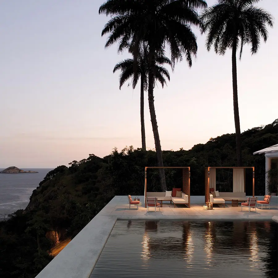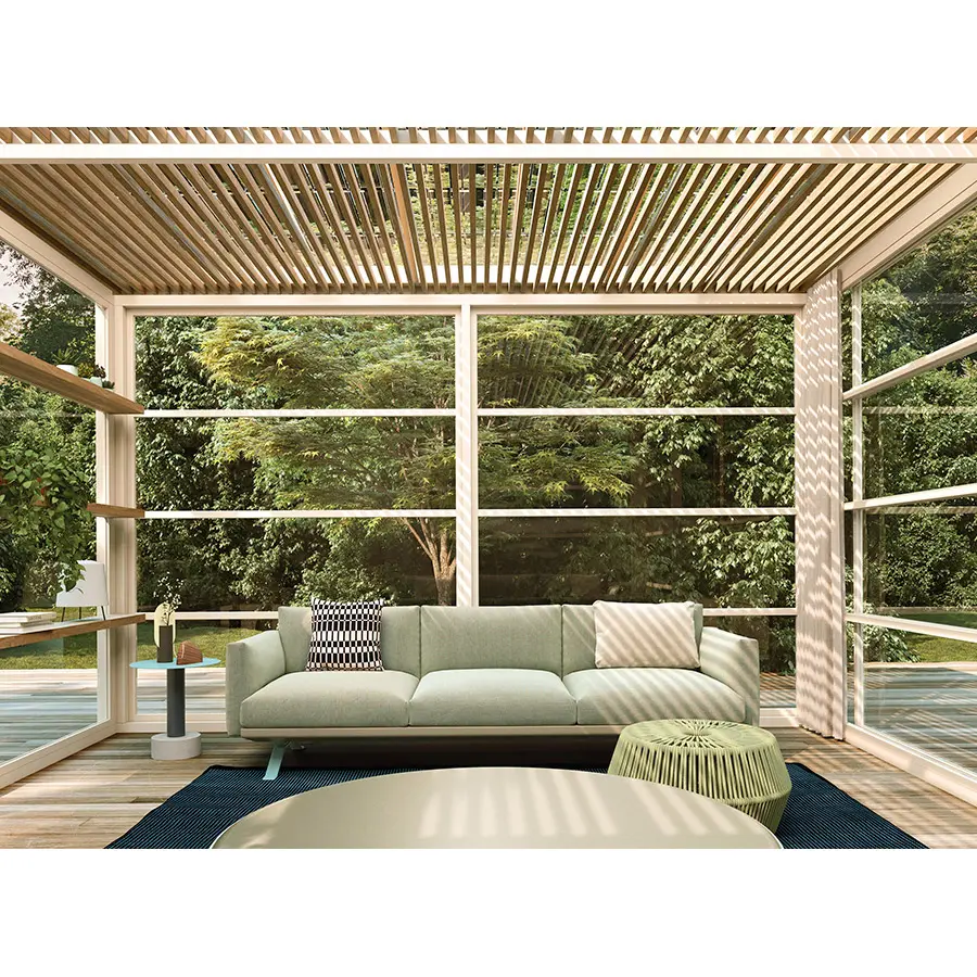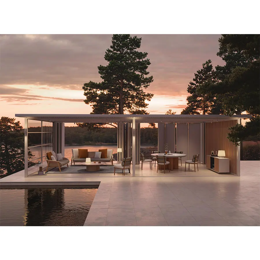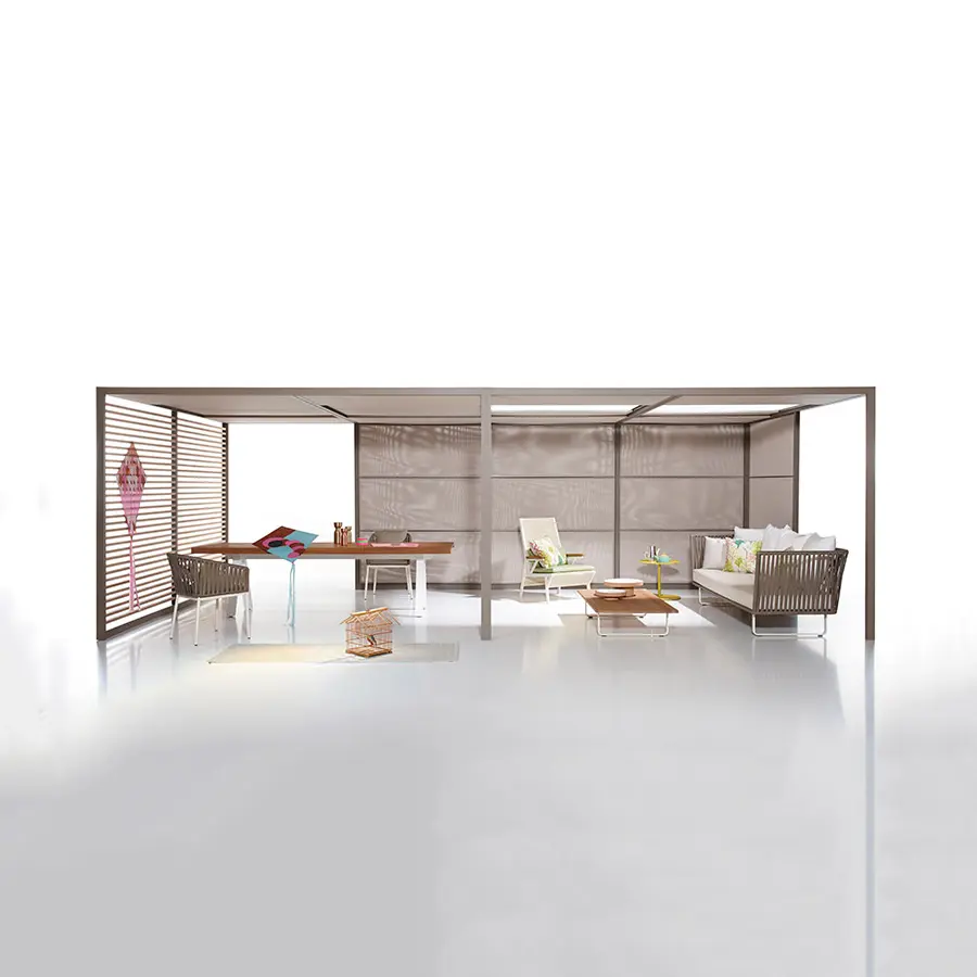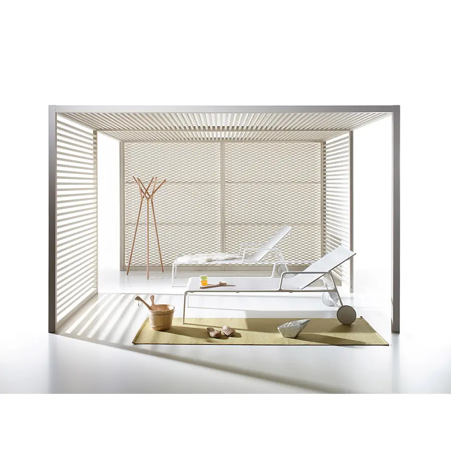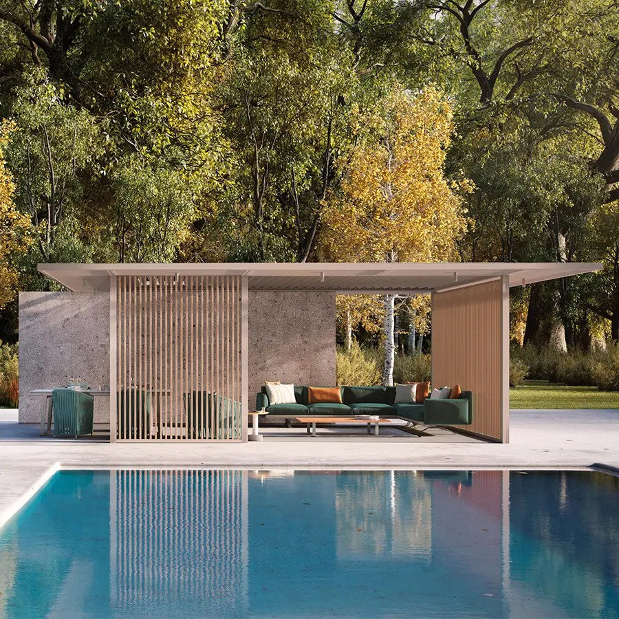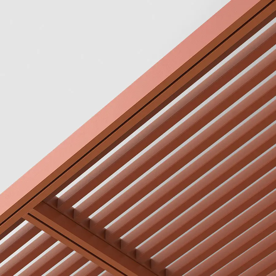 La colección de Pérgola Pavilion está compuesta por un conjunto de elementos que buscan dar orden, forma y estructura al espacio exterior, aunque funcionalmente está concebido para dar cobijo: controlar luz y el calor o proteger de la lluvia y del viento. Pretende formar parte de un proyecto. No se entiende como un elemento exento, sino que se relaciona con su entorno y pasa a formar parte de él. Es más importante el proyecto, que el producto y esa es su esencia.