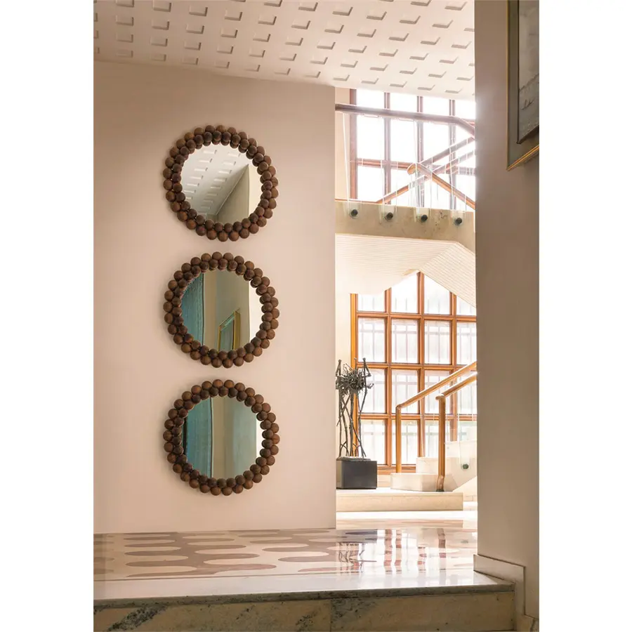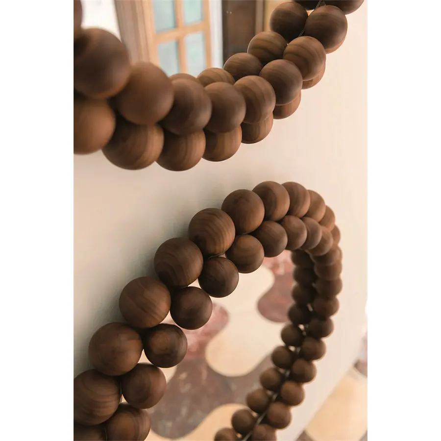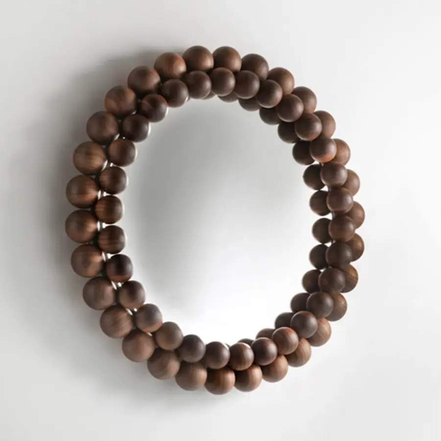 Espejo de pared con marco constituido por 60 esferas en nogal canaletta macizo.