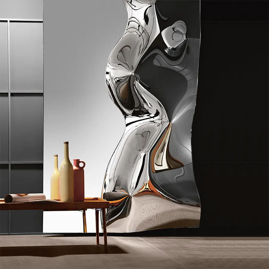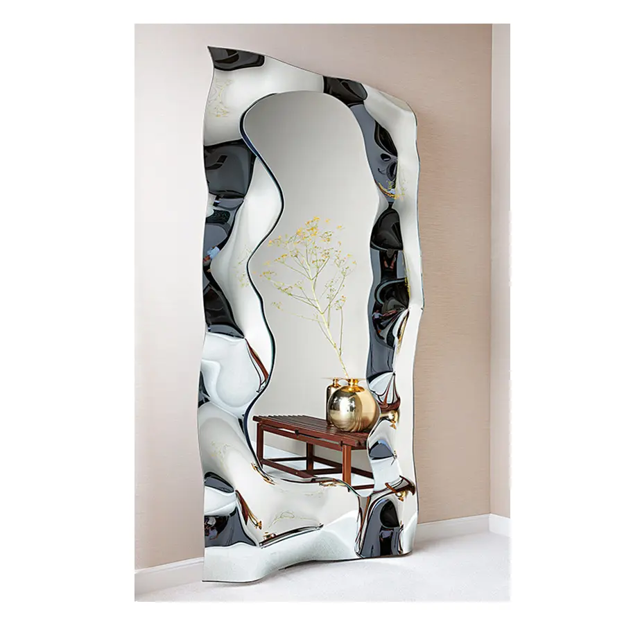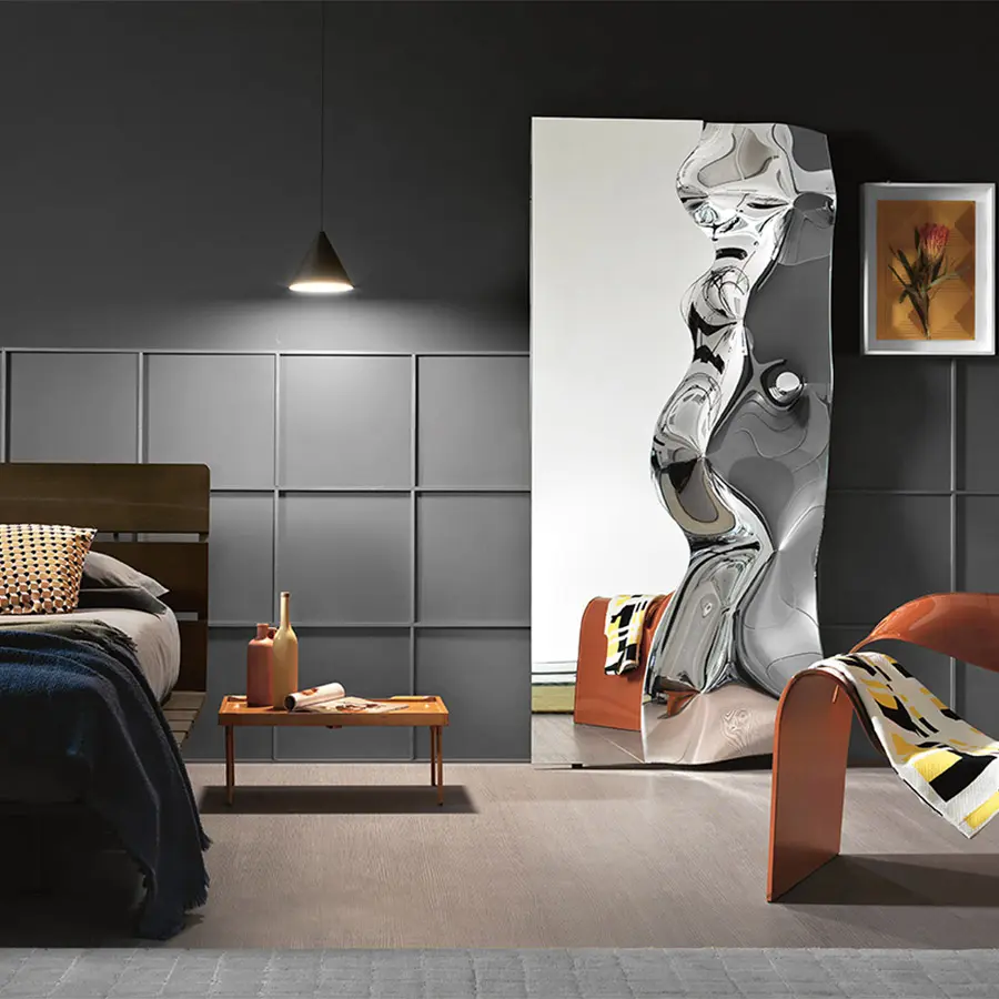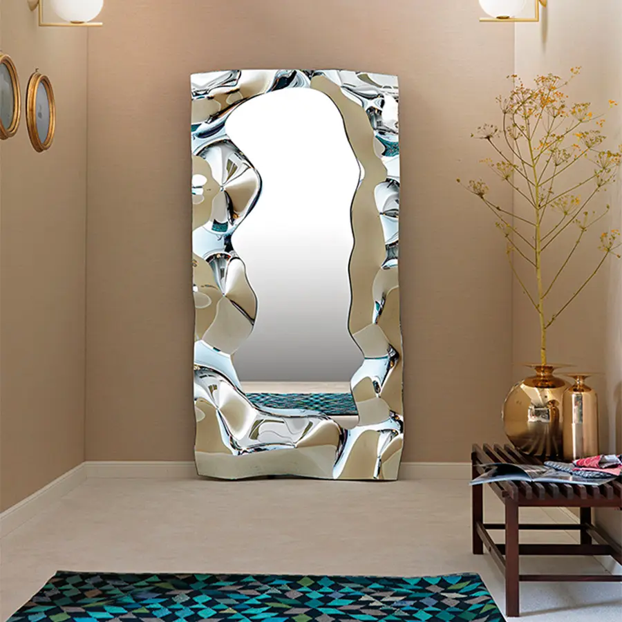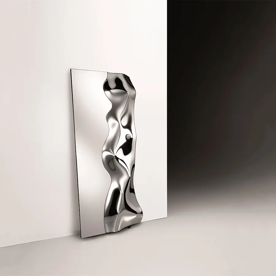 Espejo de pared en vidrio fundido a alta temperatura de 6 mm, con trasera plateada. La parte plana del espejo tiene un espesor de 5 mm. Bastidor trasero en metal pintado. Se puede colgar horizontal o verticalmente.