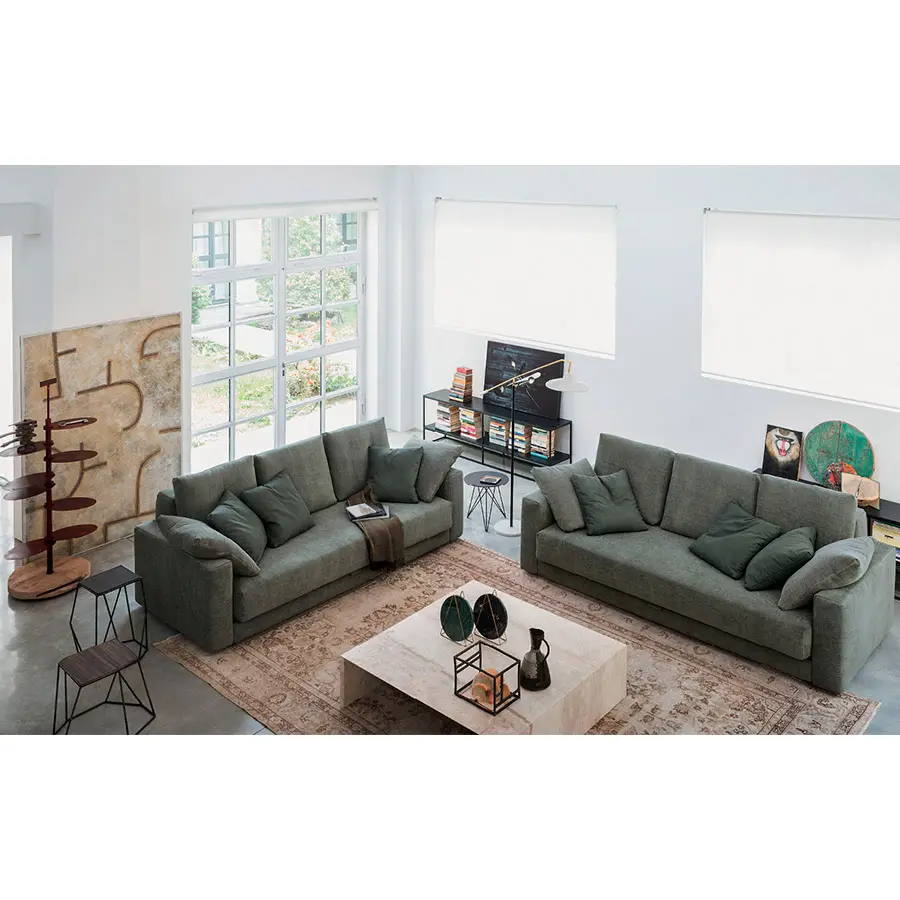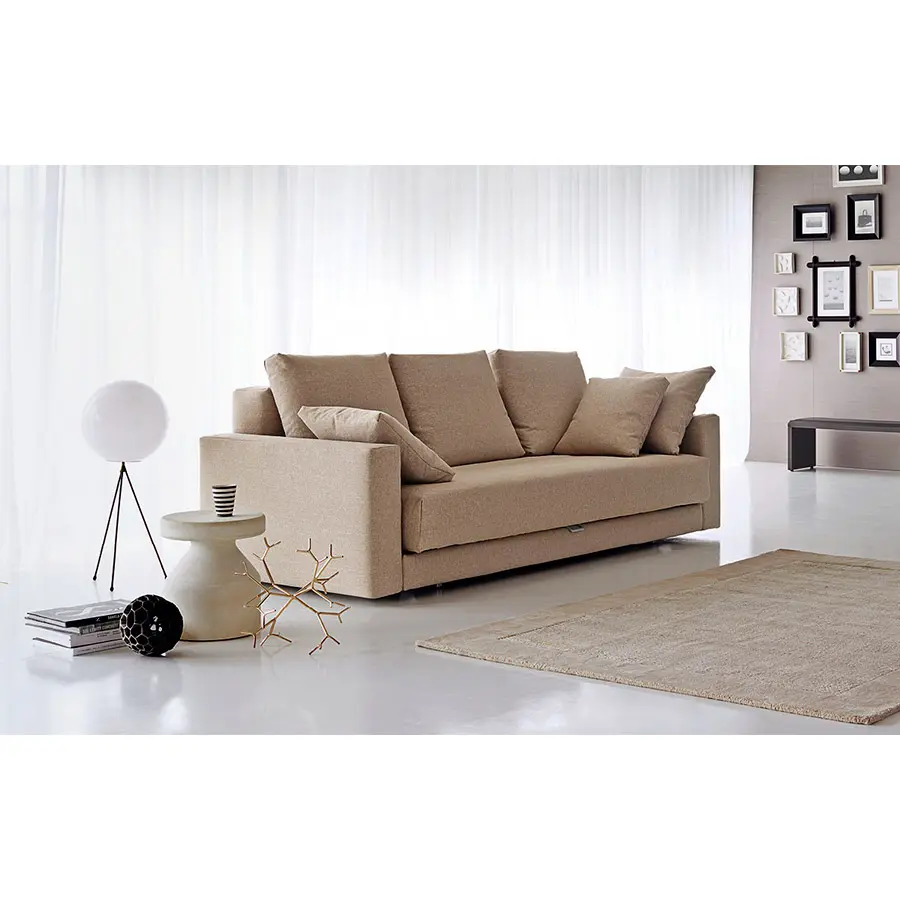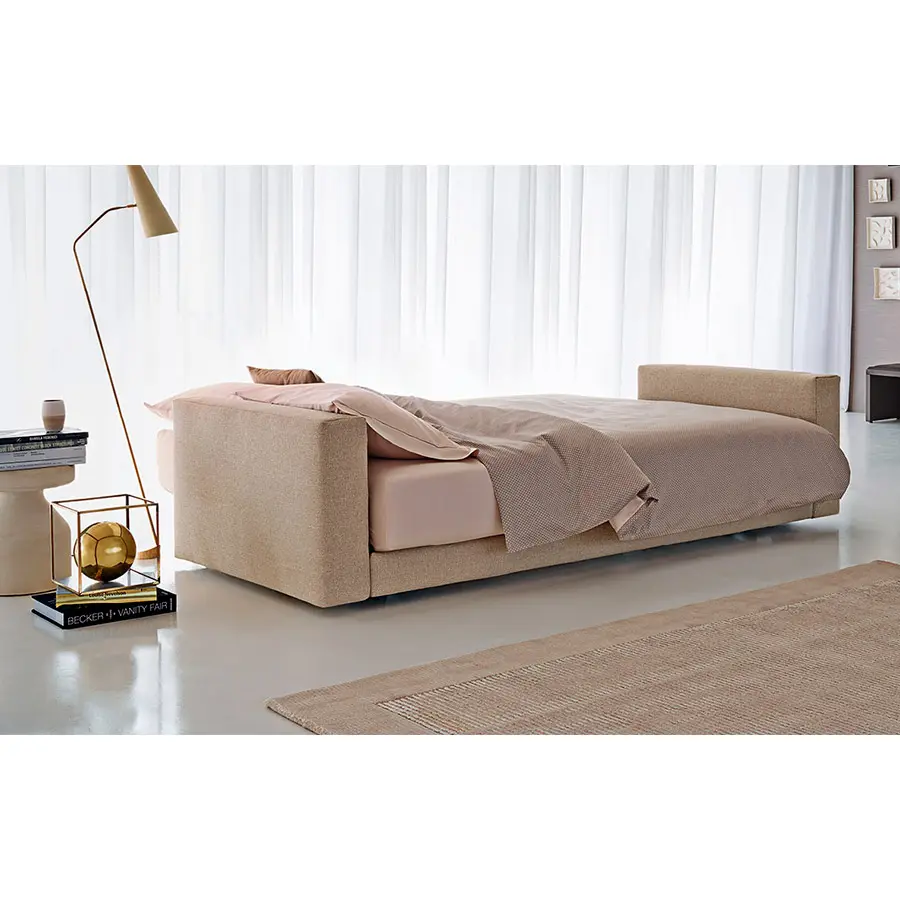 Un nuevo concepto del vivir que demuestra lo fácil que es convertir el salón en una habitación, no con el clásico transformable sino con un sofá que, con pocos gestos, se vuelve una cama individual o de matrimonio. Base con lamas y colchón de muelles ó Memoform.