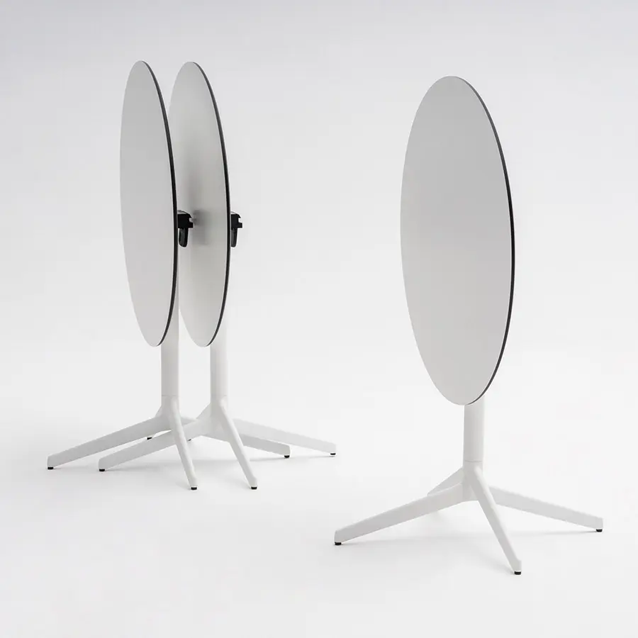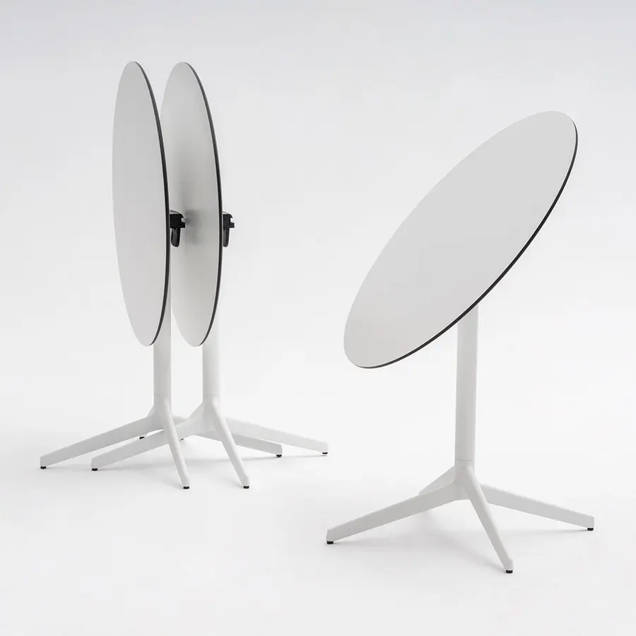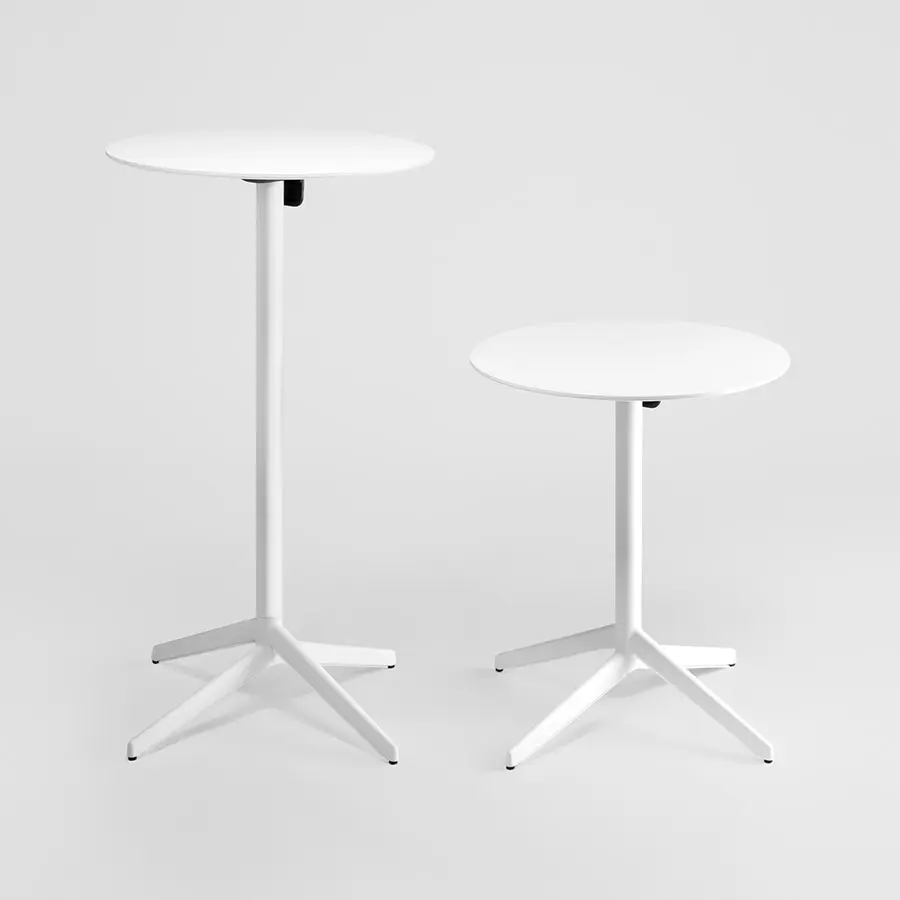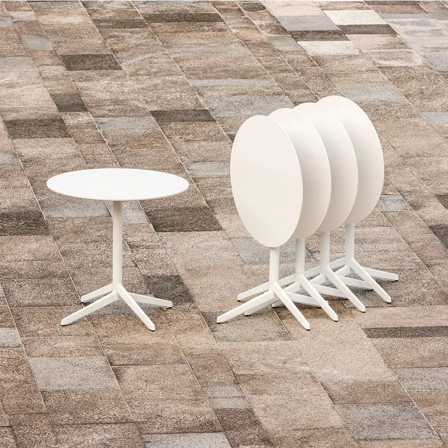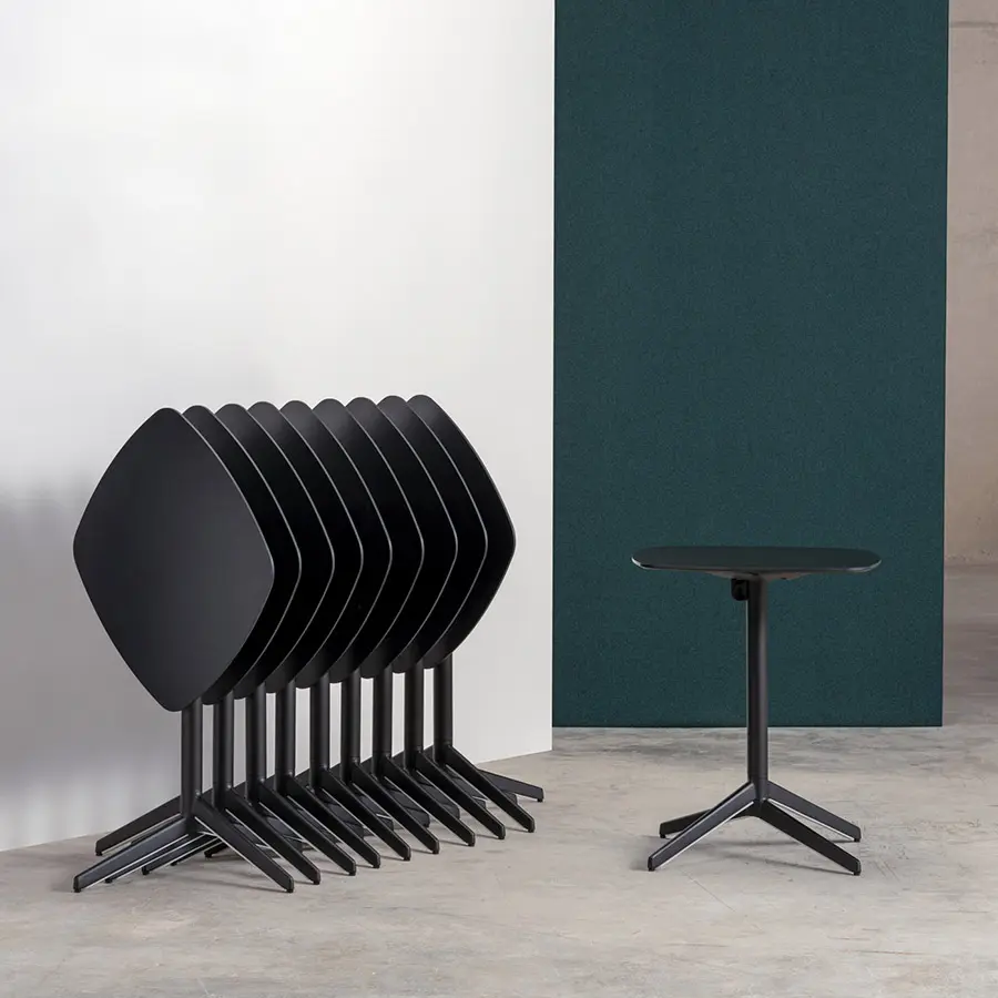 La mesa Pile ofrece un mecanismo de plegado que permite abatir las mesas de una manera muy intuitiva. Su estructura de 4 radios de aluminio pulida o lacada en cualquiera de nuestros colores está diseñada para un fácil apilado. Todo ello convierte Pile en la opción ideal para entornos dinámicos tanto en interiores como en exteriores. Además, está disponible en dos alturas y con encimeras redondas, cuadradas y cuadroides con distintos acabados.