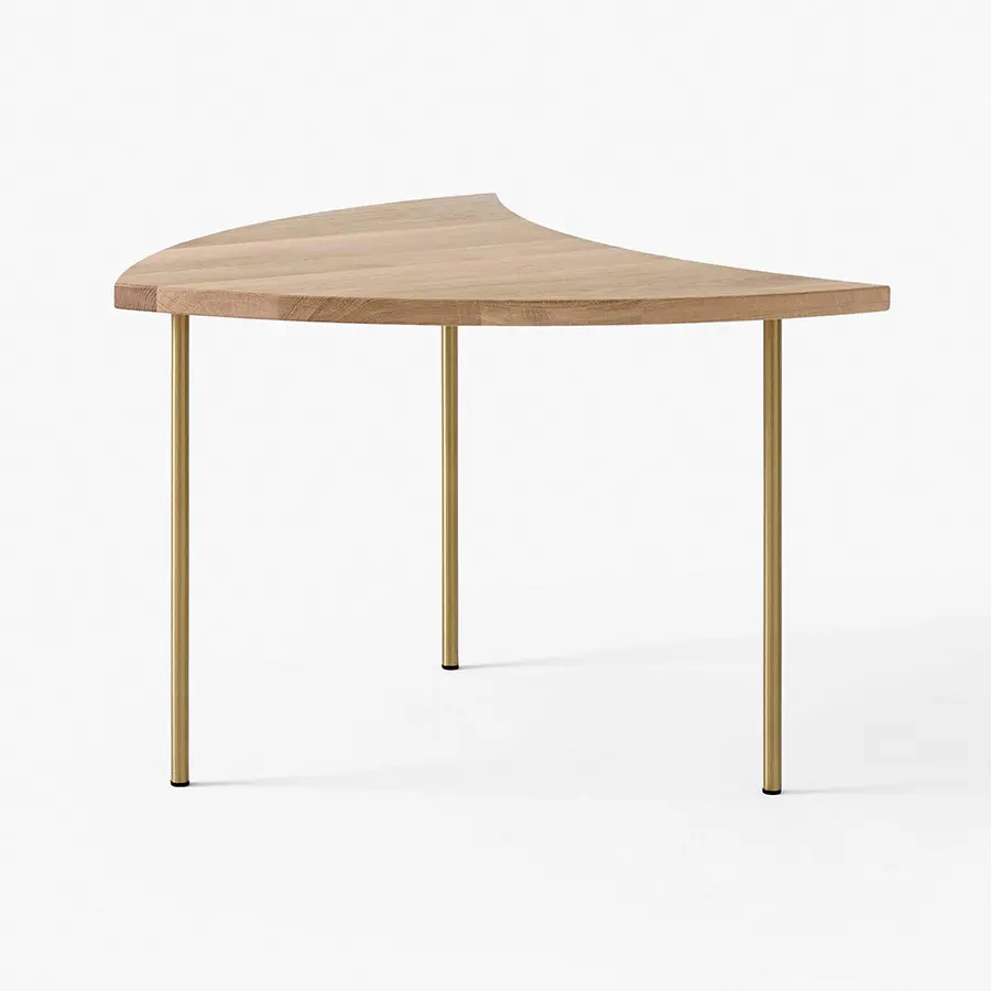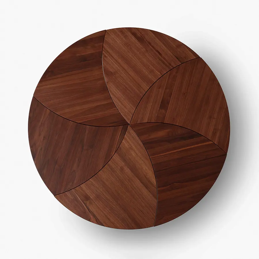 Producida por primera vez en 1953, la elegante mesa se inspira en el diseño lúdico y geométrico de un juguete de molinete. Es una pieza versátil que tiene la capacidad de agruparse para formar una mesa más grande, pudiendo convertirse en una mesa de centro redonda o alargada y rectangular. La mesa está disponible en roble natural o nogal, y las patas son de latón.