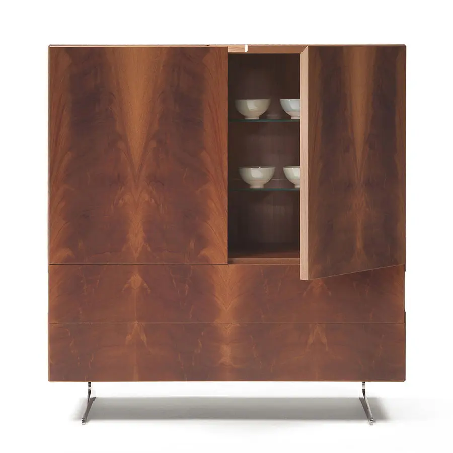 La colección de contenedores Piuma combina el rigor de la forma con la rica expresividad de la madera. La estudiada sencillez del diseño es un contrapunto a la elección del contrachapado realizado con maderas raras y preciosas, como la pluma de caoba, el ébano amara, el nogal americano y el fresno, que se ofrecen en varios tonos. La ausencia de asas, que se encuentran directamente en la estructura con unas ranuras talladas con un corte de 45°, acentúan la línea esbelta y esencial de estos muebles que se prestan para su colocación en cualquier estancia y son fáciles de combinar con todas las mesas, sillas, sofás y sillones de la colección Flexform.