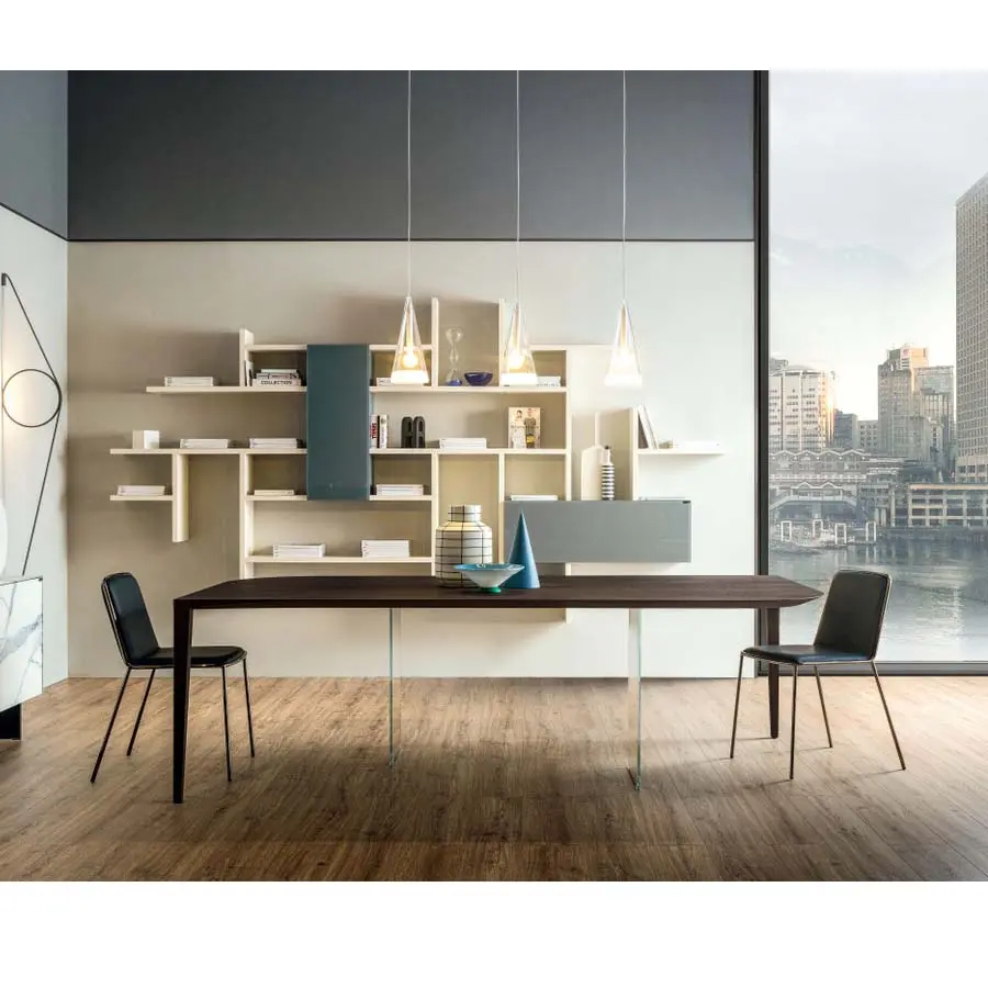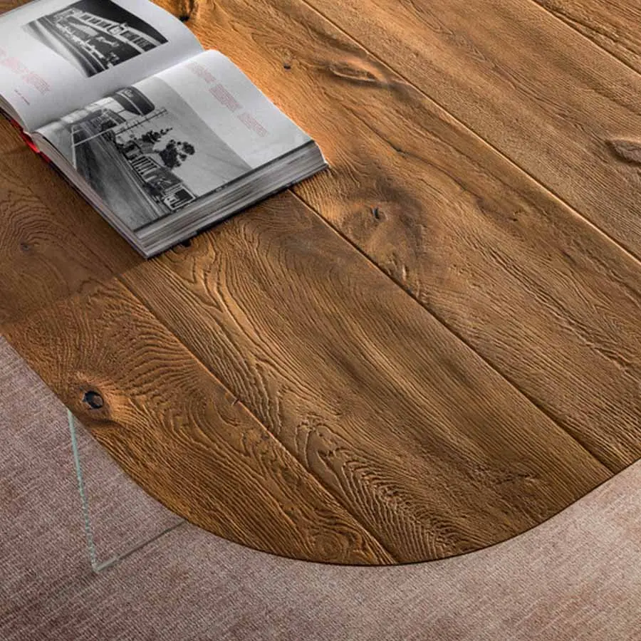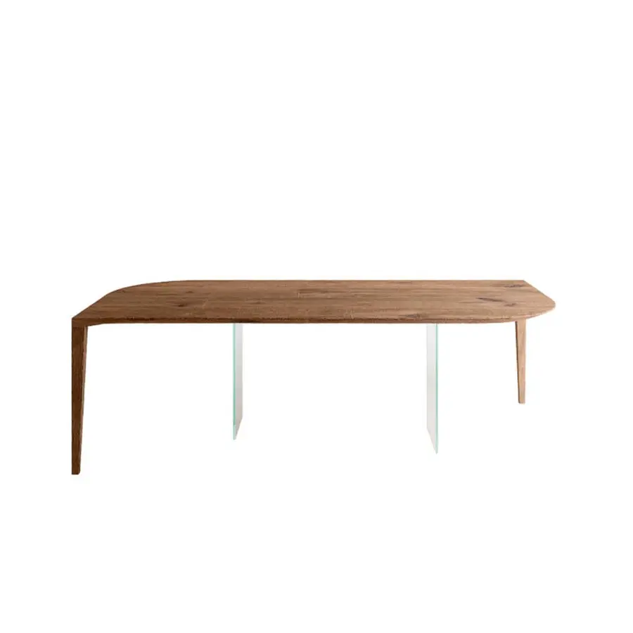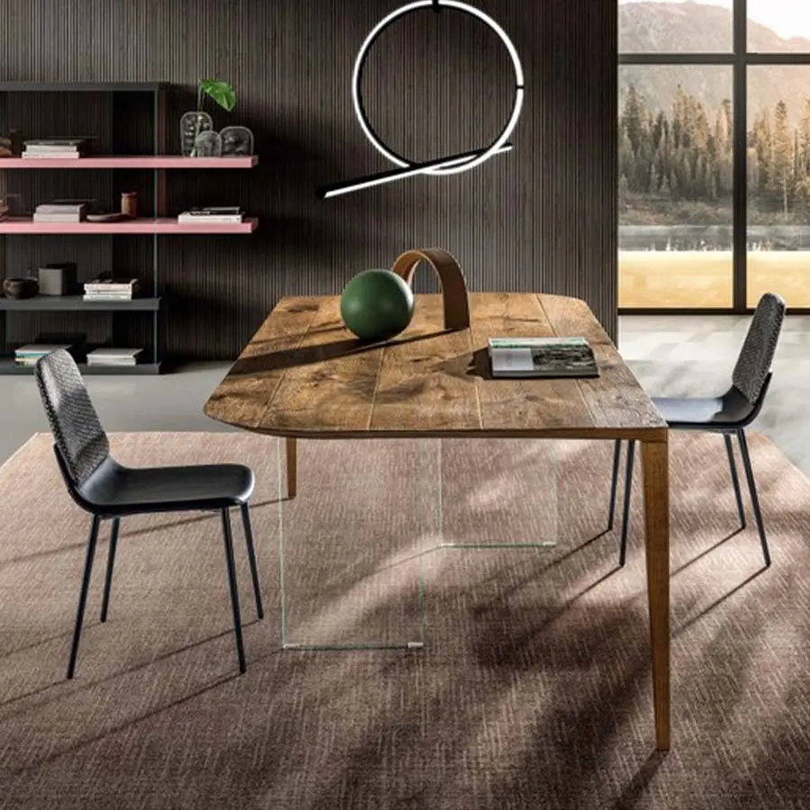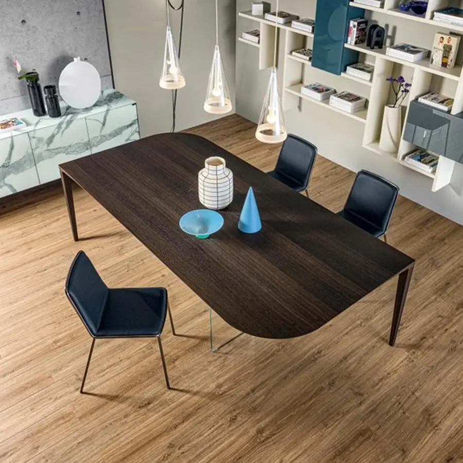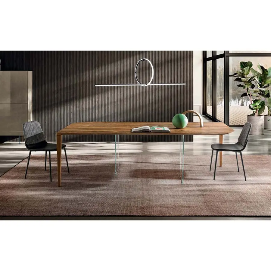 Un único flujo matérico que se desarrolla sobre dos únicos apoyos: esta es la característica principal de la mesa P&J. El fino tablero está caracterizado por esquinas redondeadas y se une armoniosamente a las patas en madera situadas en sus extremos opuestos, creando así una línea continua armoniosa y fluida. El trabajado ebanístico de la estructura y la presencia de dos imperceptibles patas de cristal situadas debajo, en el centro del tablero, garantizan solidez y resistencia, aumentando el aguante frente a golpes e impactos.