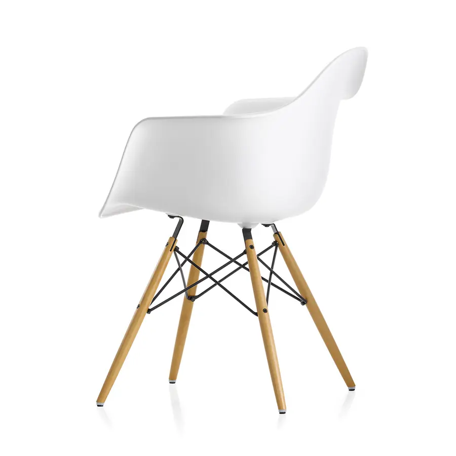 Actualmente, las Plastic Chairs de Charles y Ray Eames parecen arquetipos del género de sillas cuya carcasa puede combinarse con distintas bases. La combinación de la base de madera con la carcasa de plástico de la silla DAW (Dining Height Armchair Wood Base) ofrece un rico contraste de materiales. Las carcasas de asiento también están disponibles con un cojín de asiento o totalmente acolchadas.