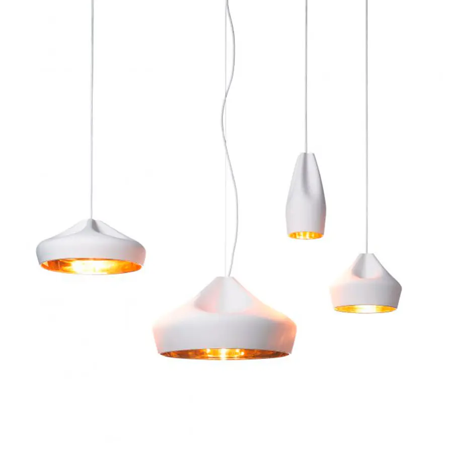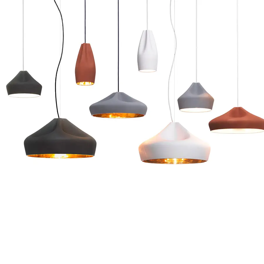El concepto de Pleat Box parte de un juego formal en el que tras diseñar digitalmente la caída del pliegue textil se aplica la silueta al material cerámico. El exterior de la lámpara se ofrece en cerámica blanca, negro, terracota y gris –resultado de reciclar diferentes esmaltes. El interior es de esmalte blanco brillante, que emite unos destellos que enriquecen la luz de la lámpara, o en oro de 24k generando una luz extremadamente cálida.