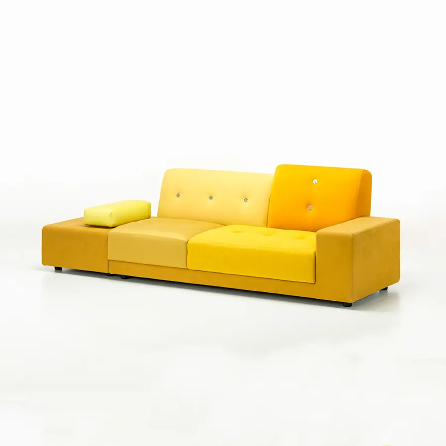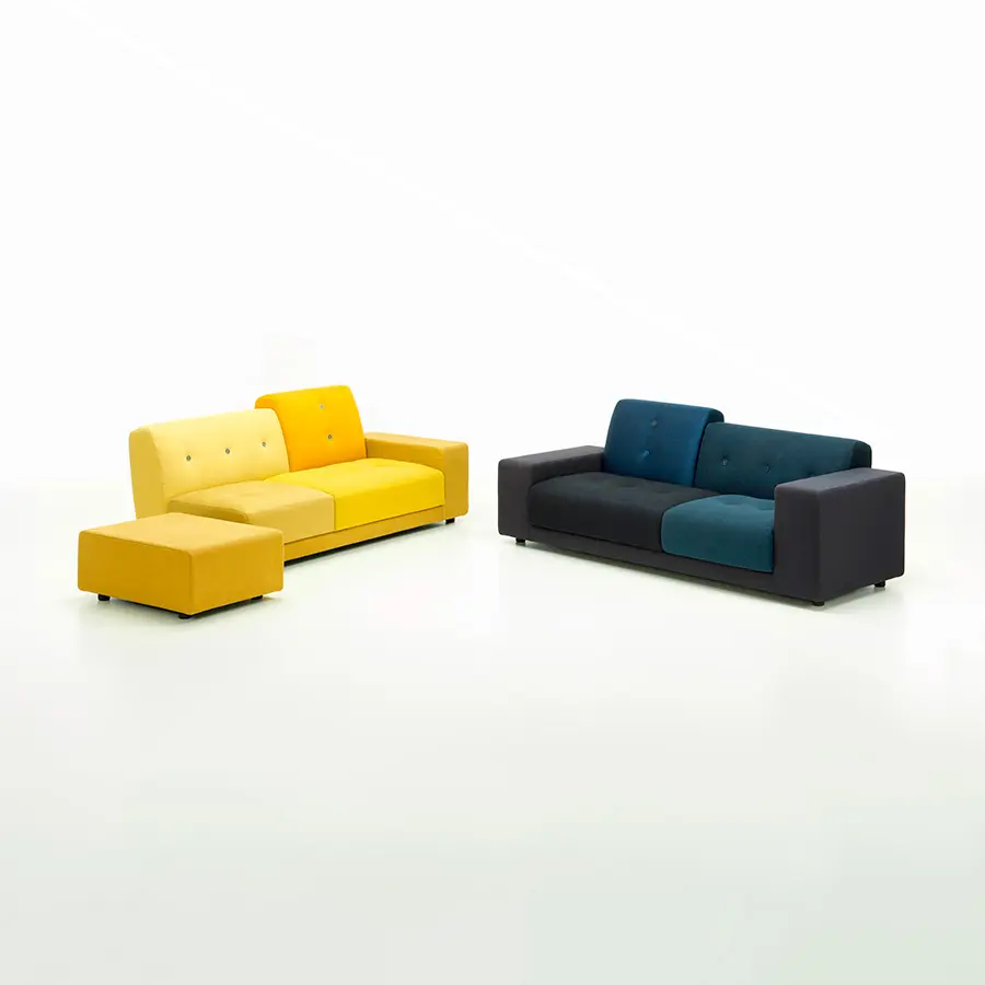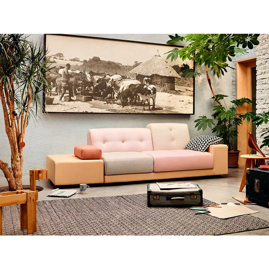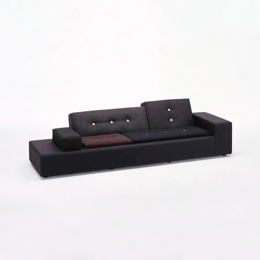 Polder se designa en Holanda a la tierra ganada artificialmente al mar mediante la colocación de diques y zanjas de drenaje. El cuerpo del sofá Polder está situado igual de bajo y se presenta igual de plano, resaltando asimismo la línea horizontal. Hella Jongerius eligió para este sofá cinco combinaciones de colores y tapicerías a juego que acentúa con hilo de alta tecnología y grandes botones de materiales naturales.