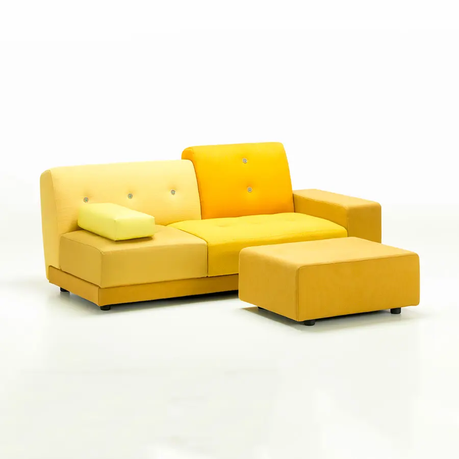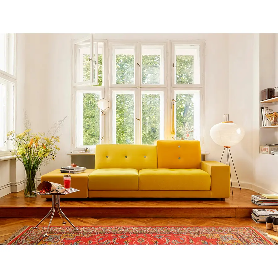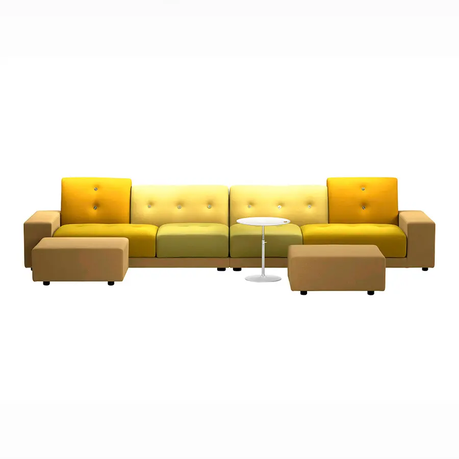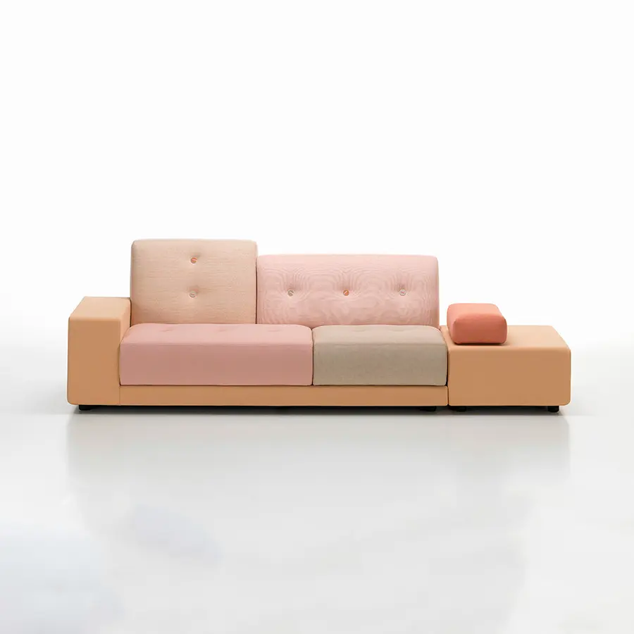 Polder se designa en Holanda a la tierra ganada artificialmente al mar mediante la colocación de diques y zanjas de drenaje. El cuerpo del sofá Polder está situado igual de bajo y se presenta igual de plano, resaltando asimismo la línea horizontal. Hella Jongerius eligió para este sofá cinco combinaciones de colores y tapicerías a juego que acentúa con hilo de alta tecnología y grandes botones de materiales naturales.