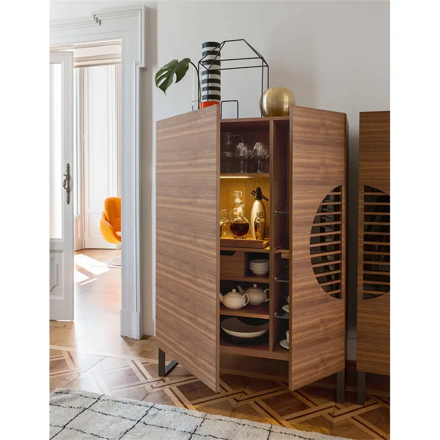Mueble bar de dos puertas en nogal canaletta con patas de metal. En el interior hay un compartimiento iluminado con luz de LED con tapa extraíble de madera, cajón, bandeja de madera revestida de cuero, estantes de cristales y de madera. Polifemo está disponible en versión derecha/izquierda, las medidas son 110x52x155H