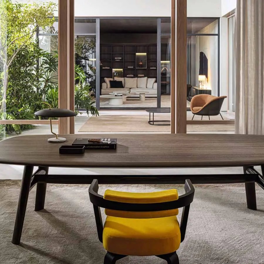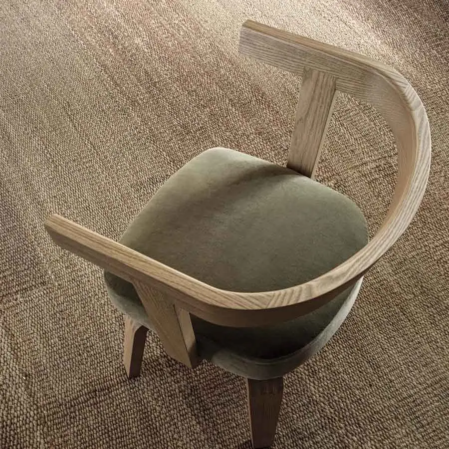La Silla Porta Volta es impactante. El elemento que define el diseño es el respaldo de madera maciza curvado a forma de U, que crea una sensación acogedora y envolvente. El respaldo flexible se extiende para crear los reposabrazos. Si así se desea, el respaldo puede dividirse en dos con un cojín personalizable. Tres travesaños a U con una exclusiva «juntura dentada» curvada confieren a la pieza una delicadeza especial. Las cuatro patas y el respaldo están ligeramente angulados hacia fuera, lo que proporciona un reposo estable y cómodo.