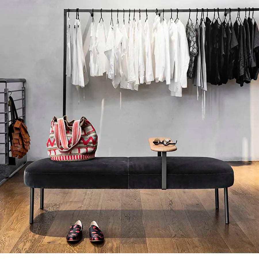 La colección de asientos tapizados RAKU —que abarca butaca + puf , sofá, silla y banqueta— ofrece una imagen moderna y sobria. El asiento y el respaldo están definidos por volúmenes simples y redondeados. Las patas, igualmente sencillas, están formadas por un tubo vertical que parece apoyarse simplemente por fuera de los volúmenes. La banqueta tapizada incluye también un reposabrazos de madera que la divide en sentido transversal, creando una superfcie de apoyo funcional. Disponible con revestimiento de piel y de tejido, RAKU es perfecta para aportar un toque de confort a la zona de día, como en la zona de noche.