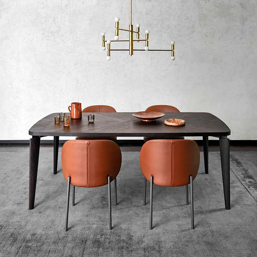 La colección de asientos tapizados RAKU —que abarca butaca + puff, sofá, silla y banqueta— ofrece una imagen moderna y sobria. El asiento y el respaldo están definidos por volúmenes simples y redondeados. Las patas, igualmente sencillas, están formadas por un tubo vertical que parece apoyarse simplemente por fuera de los volúmenes. La banqueta tapizada incluye también un reposabrazos de madera que la divide en sentido transversal, creando una superficie de apoyo funcional.