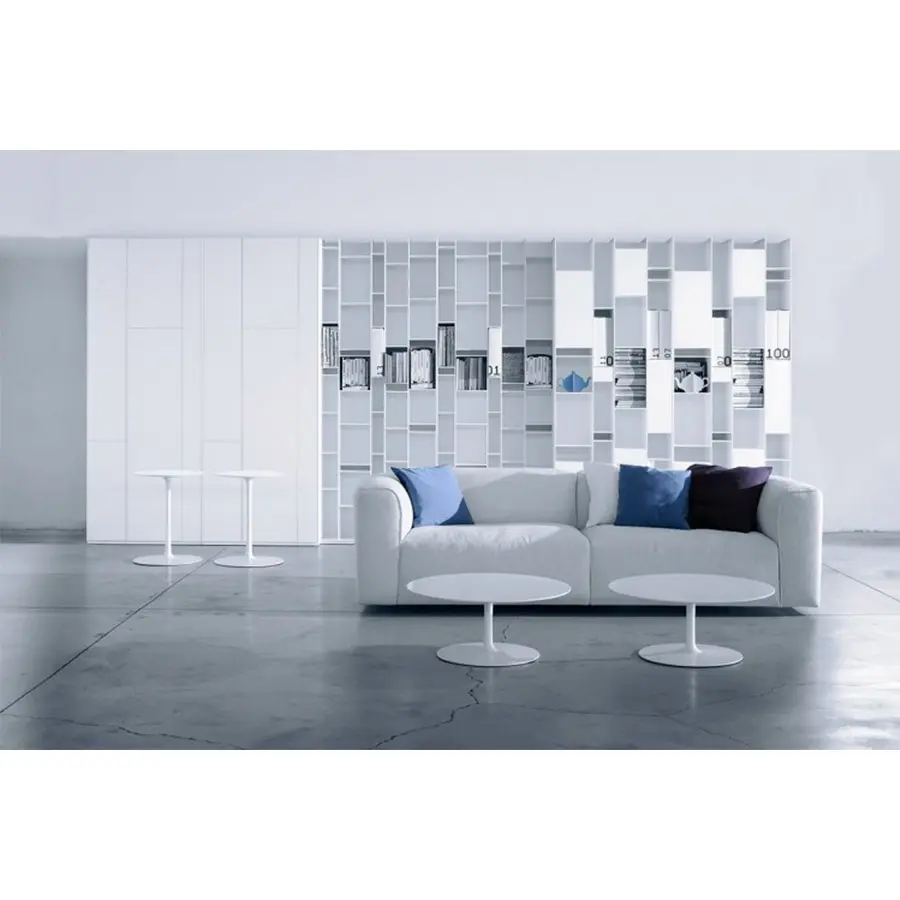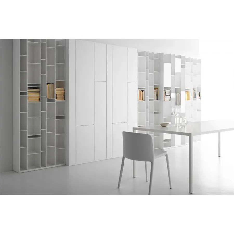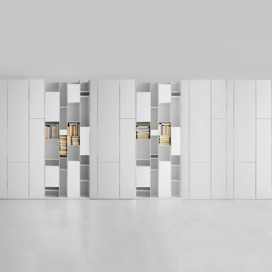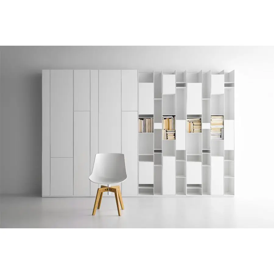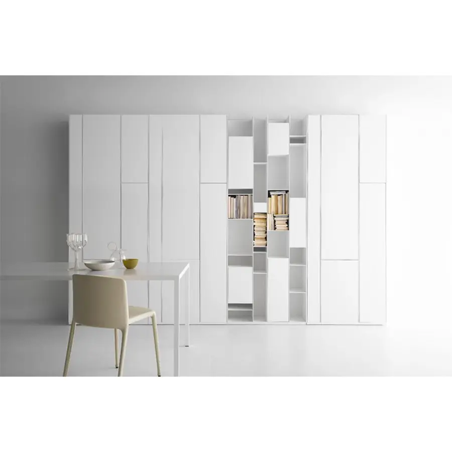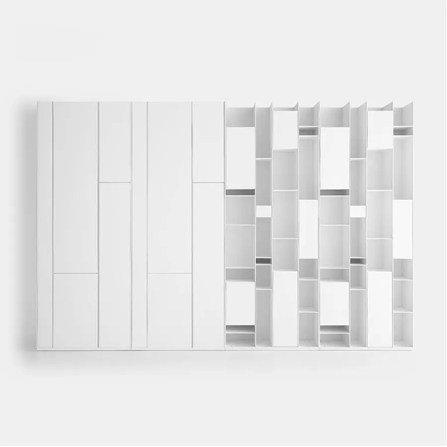 Una unidad de almacenamiento con compartimentos de tamaño estándar, cerrados por puertas. Hecho de tableros de fibra de madera de densidad media, en laca blanca micro gofrada. La unidad individual siempre se puede voltear. Al flanquear más unidades, puede crear configuraciones de gran tamaño de gran impacto, también junto con Random Box y Random unit.