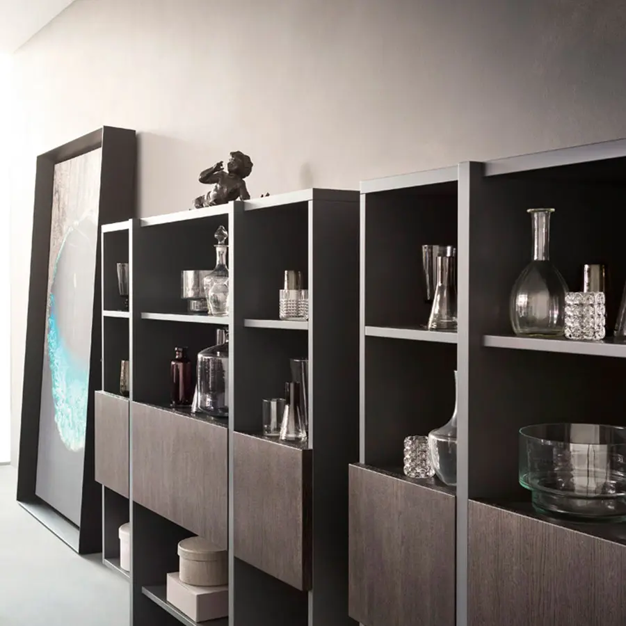 Recta está disponible en versión aparador, aparador alto y librería. Recta crea contrastes cromáticos entre los frontales de puertas y cajones y la estructura, en la que las divisiones sirven también de base. Las puertas centrales de los aparadores y aparadores altos se abren del todo, hasta los 180°. Amplias posibilidades de composición modular y configuración, con la opción del lacado interno.