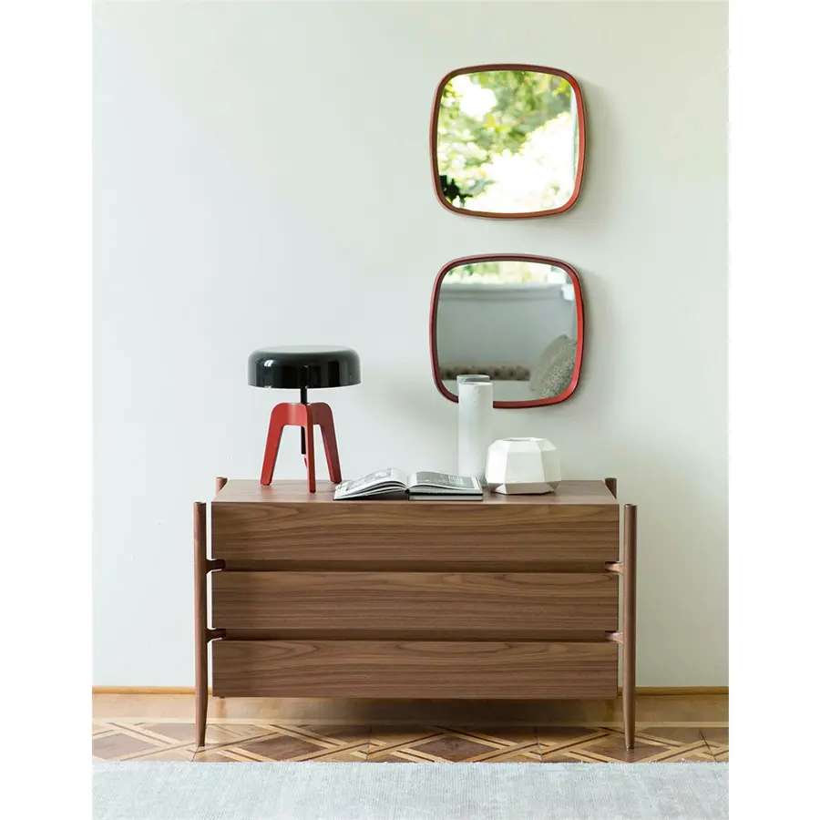 Cajonera de tres cajones con sistema de cierre automático desacelerado con estructura de nogal canaletta macizo y cajones de madera o revestido de piel o piel extra.