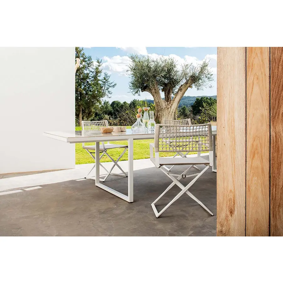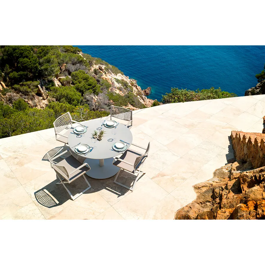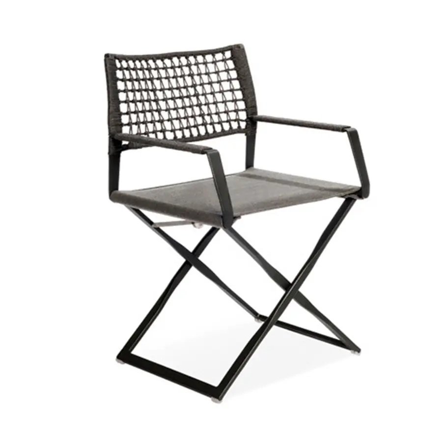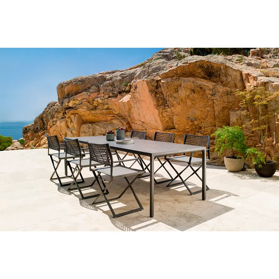 Regista es una silla fina, perfectamente equilibrada, que destaca por su diseño atemporal. El respaldo se ha tejido a mano con Tricord, una fibra resistente a la intemperie que también se ha utilizado en el tapizado de los reposabrazos. La fibra parece de cuerda, algo que explica el aspecto y la sensación naturales de la silla. Además, Regista debe su perfil robusto y fino al uso de acero inoxidable con recubrimiento de polvo, con el que se han construido la parte posterior y los reposabrazos. Las esbeltas patas se han acabado con aluminio recubierto de polvo.