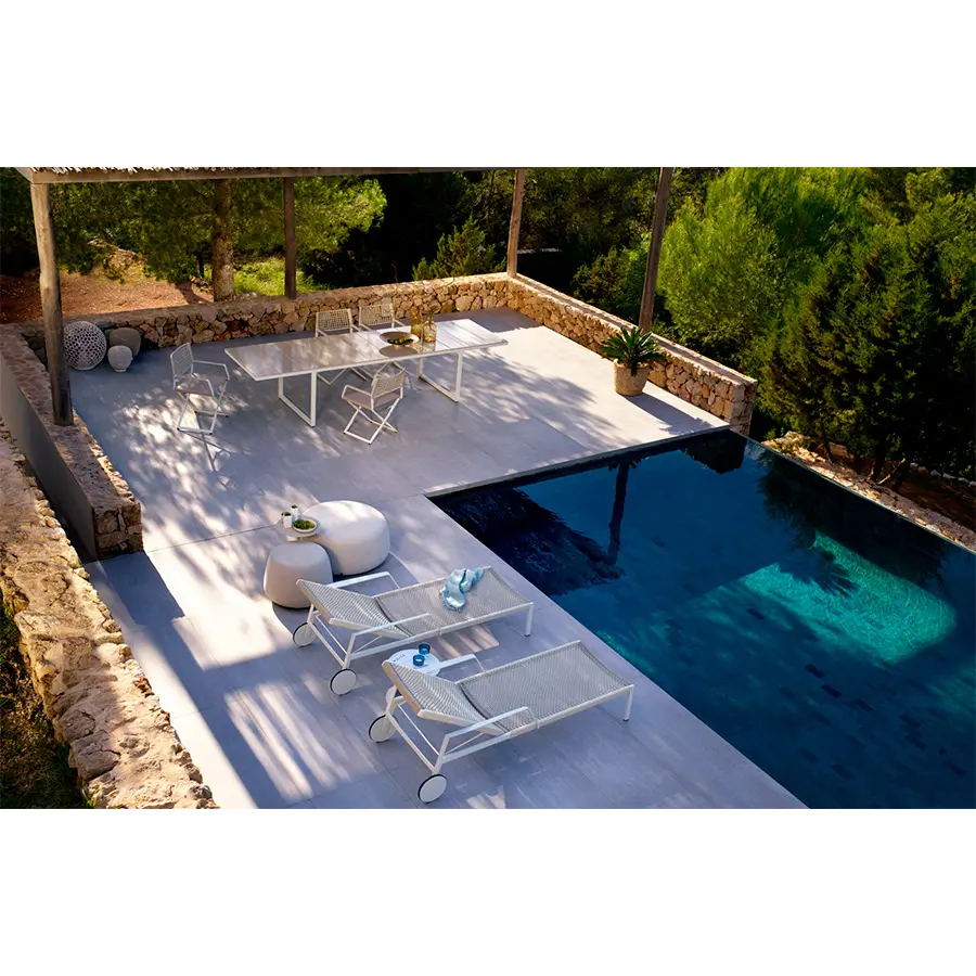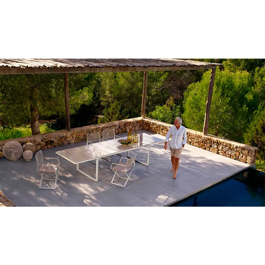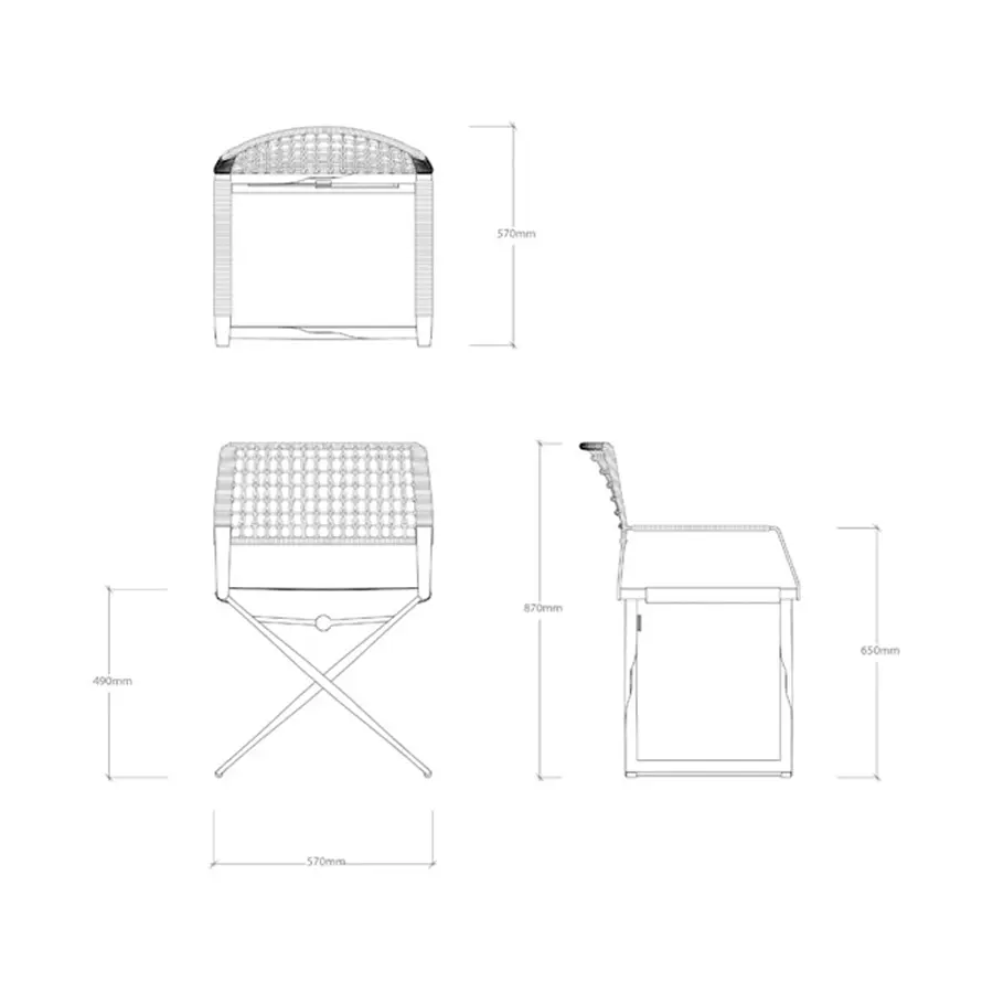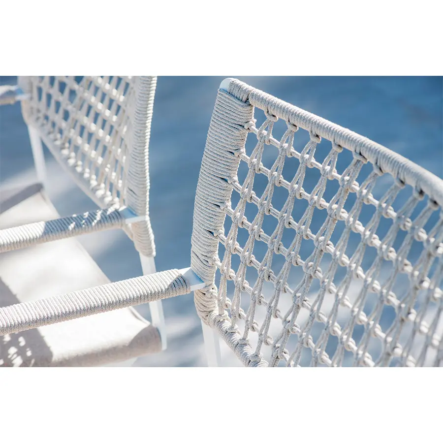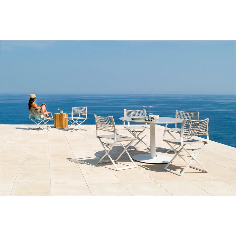 Regista es una silla fina, perfectamente equilibrada, que destaca por su diseño atemporal. El respaldo se ha tejido a mano con Tricord, una fibra resistente a la intemperie que también se ha utilizado en el tapizado de los reposabrazos. La fibra parece de cuerda, algo que explica el aspecto y la sensación naturales de la silla. Además, Regista debe su perfil robusto y fino al uso de acero inoxidable con recubrimiento de polvo, con el que se han construido la parte posterior y los reposabrazos. Las esbeltas patas se han acabado con aluminio recubierto de polvo.