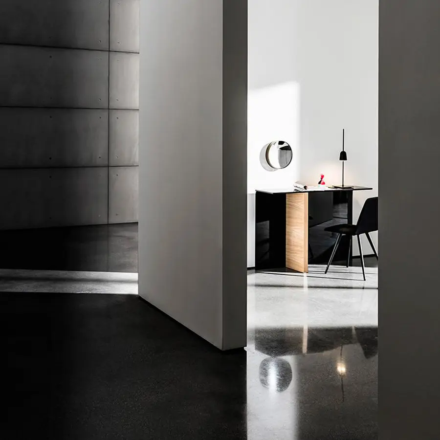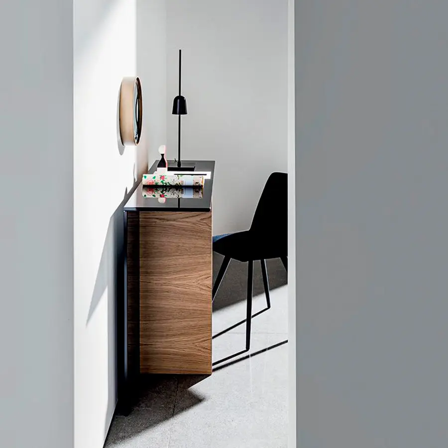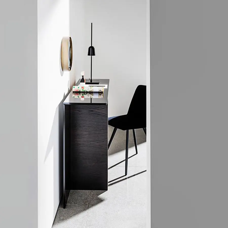 Consola con tapa de cristal laminado ahumado. Base compuesta por un elemento de madera, varios acabados y un elemento de vidrio lacado negro. La consola Regolo cuenta con diferentes formas geométricas y varias combinaciones de materiales que crean infinitos usos y posibilidades de configuración. Un concepto simple del que surge una completa colección de mesas y accesorios para cualquier tipo de ambiente.