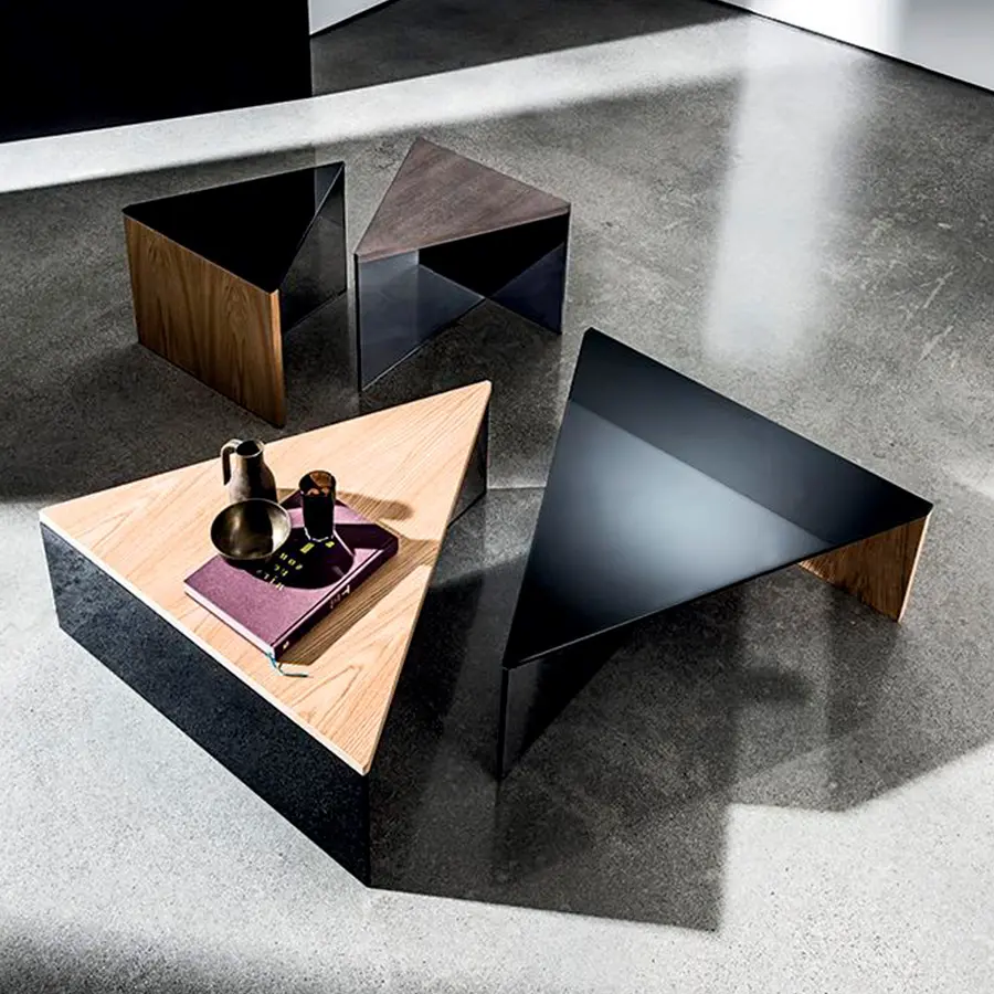 Mesa de centro moderna triangular disponible con tapa en vidrio laminado negro o en madera, varios acabados.