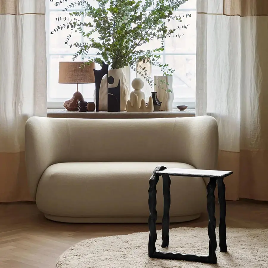Sofá cómodo, cálido y acogedo de ferm LIVING es tan elegante como encantador. Tapizado en tejidos hermosos, su perfil redondeado y espacioso es perfecto para relajarse con la familia y los amigos. Con una estructura duradera y sin patas, su tapizado expansivo se extiende hasta el suelo, resultando en un sofá elegante y único que se integra perfectamente en cualquier entorno.