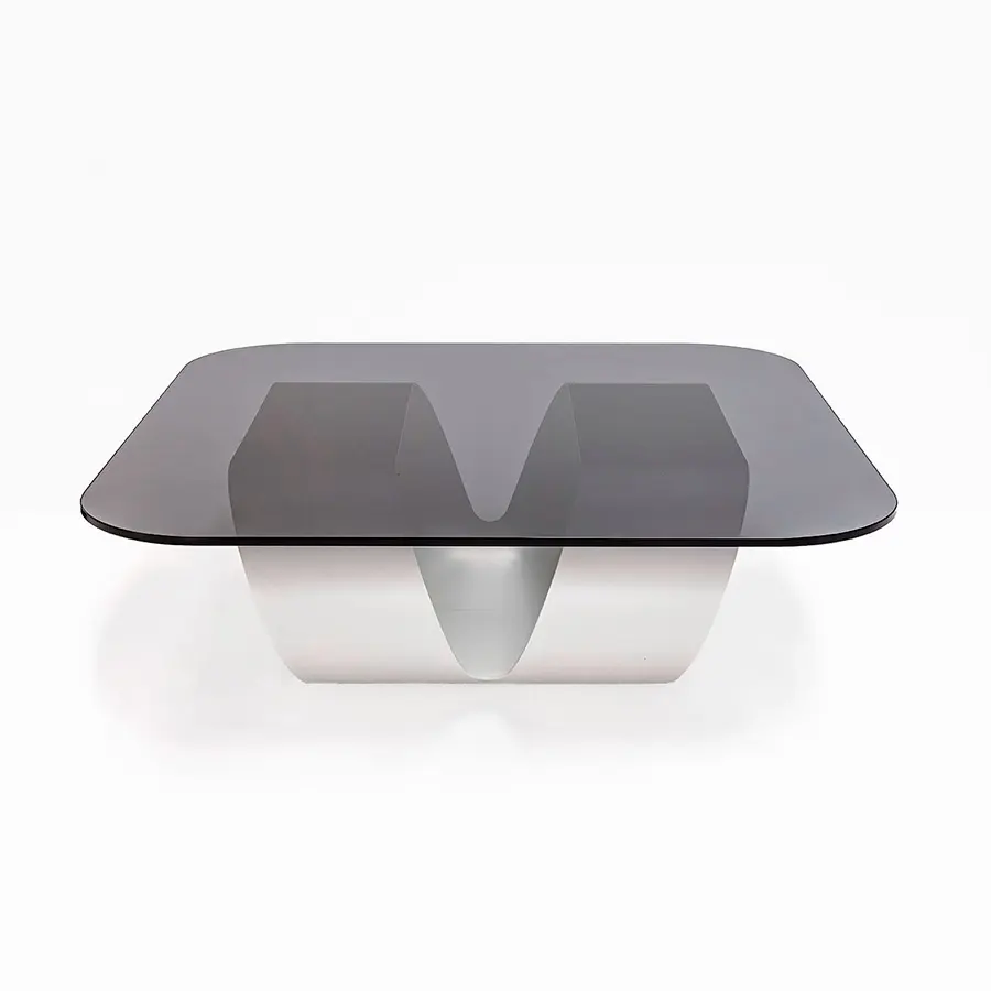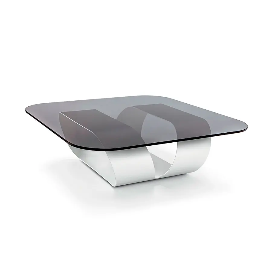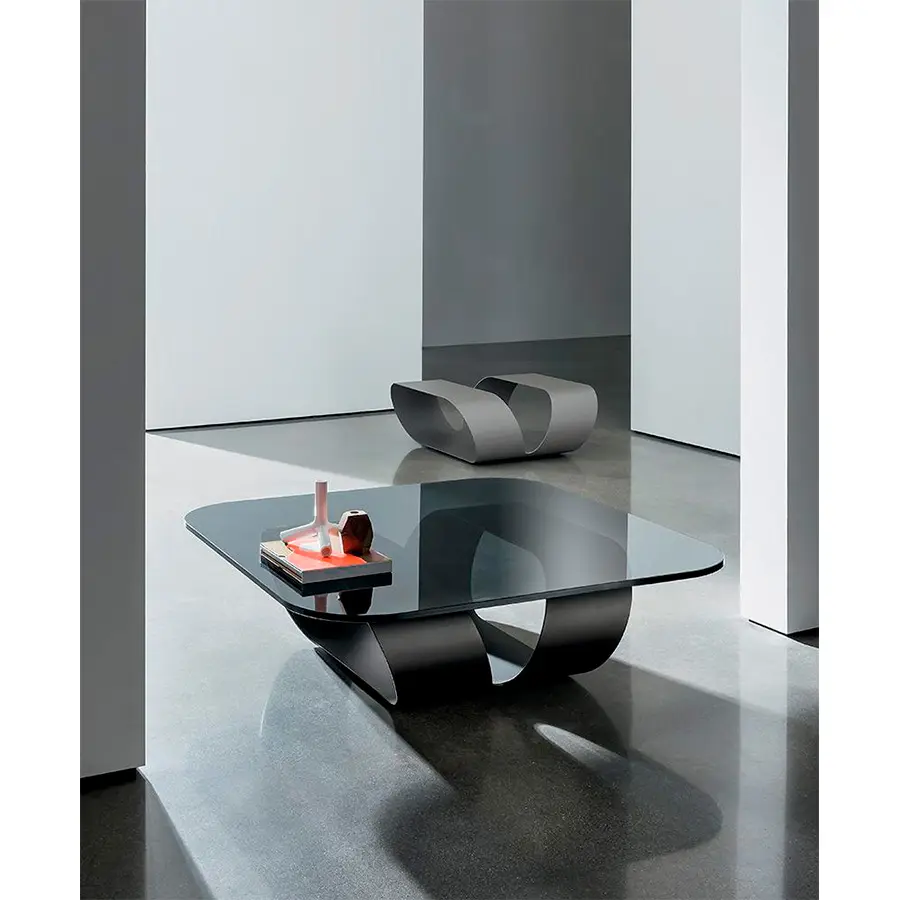 Mesa de centro de vidrio doblado extraligero, ahumado o lacado, mono o bicolor. Las imposibles figuras de Escher inspiran una mesa de café que funda su singularidad en el diseño particular de la base, disponible individualmente o combinado con una tapa de vidrio.