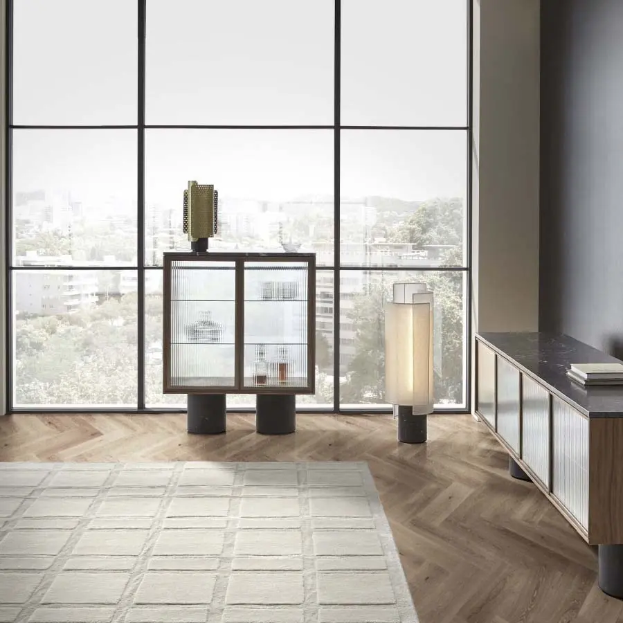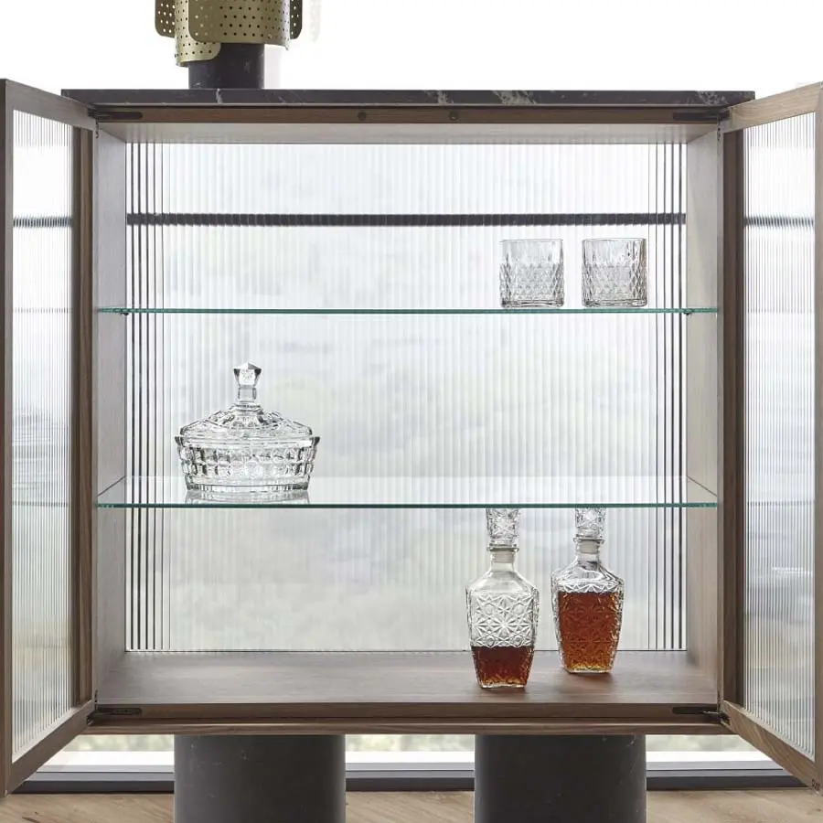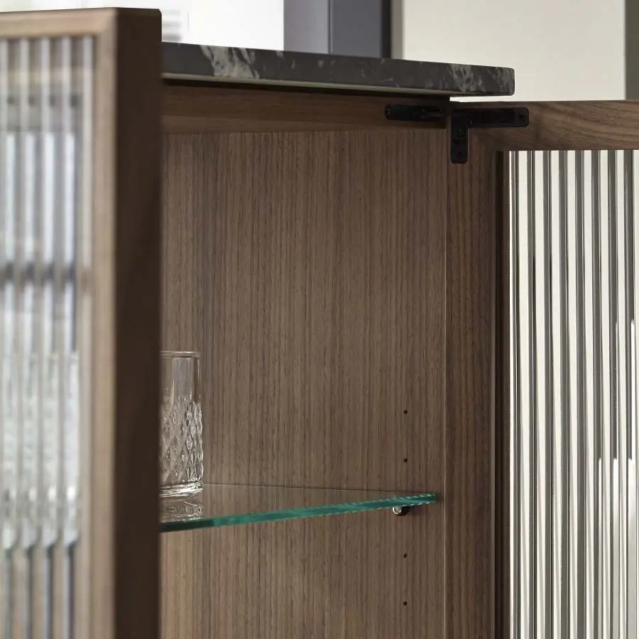 El interior y exterior de la vitrina están hechas de tableros de fibra de MDF con chapa de madera de nogal. Cada módulo incluye un estante interno de vidrio templado fijo en el centro, con una parte superior de mármol Marquina mate y totems, puertas de madera maciza de nogal y vidrio templado ondulado. Cuenta con patas tipo tótem con mecanismos ajustables integrados y puertas con bisagras sin mangos que se abren 105 grados con bisagras ocultas. Viene completamente ensamblado.