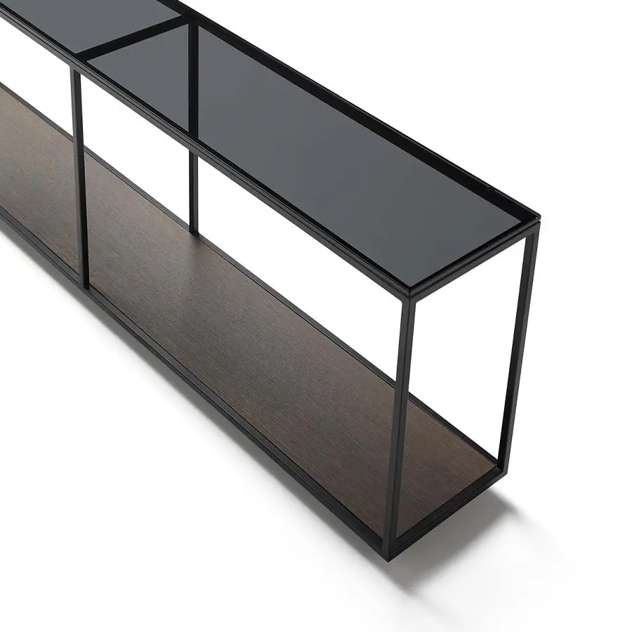 La combinación de sus acabados facilita la integración del mueble en cualquier interior. Materiales como cristal, nogal y roble alcanzan una gran armonía entre ellos y, al mismo tiempo, elevan el nivel del espacio. La base está disponible en diferentes acabados para adecuarse a las necesidades de cada proyecto. Destaca como una propuesta atemporal y versátil tanto en hogar como en instalaciones.