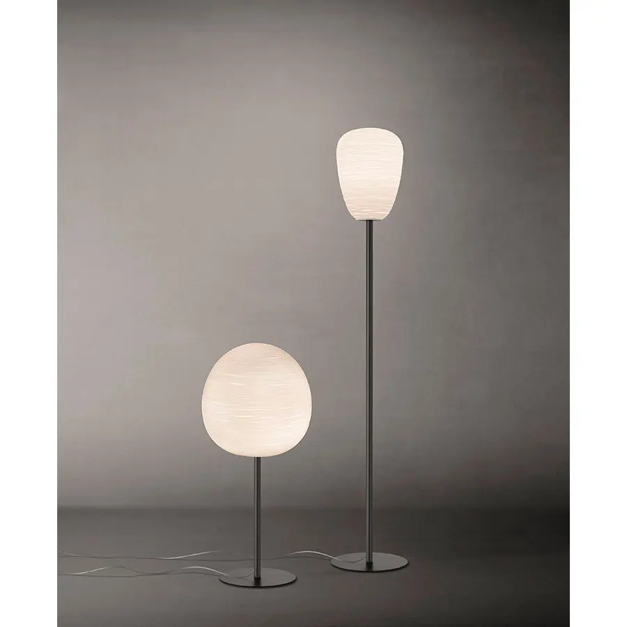 Una familia de lámparas con una luz relajante para ambientes muy diversos que interpreta la magia del papel de arroz o de la corteza de morera, materia prima de las lámparas japonesas, en la corporeidad preciosa del vidrio soplado y satinado. Las líneas horizontales que inciden en la superficie de las lámparas producen una decoración suave y fascinante a la vez que moderna, además de contribuir a filtrar la intensidad de la fuente de iluminación, difundiendo una luz plena, cálida y suave en el ambiente.