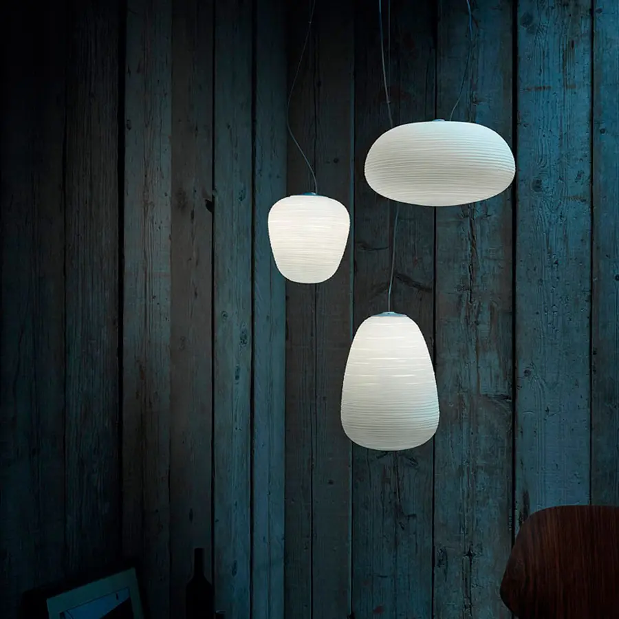 Lámparas colgante de luz difusa. Uno, dos, tres faroles ligeros pero repletos de seductora matericidad. Tres formas distintas y al mismo tiempo complementarias, en equilibrio entre oriente y occidente. Una familia de lámparas que lleva una luminosidad relajante en los ambientes más diversos, traduciendo la magia del papel de arroz o de la corteza de la morera, materia prima de las lámparas japonesas, en la apariencia preciosa del vidrio soplado y satinado.