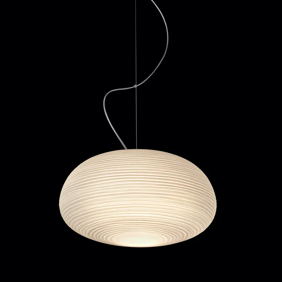 Las líneas horizontales, que graban la superficie de las lámparas, dan vida a una decoración suave y fascinante pero, contemporáneamente, contribuyen a filtrar la intensidad de la fuente luminosa, difundiendo una luz llena, cálida y suave en el ambiente. Con su cuerpo en vidrio soplado, de apariencia agradablemente yesosa, las lámparas Rituals de de suspensión se pueden utilizar solas o en composiciones armoniosas de 3 y hasta 9 lámparas, gracias a la utilización de un florón múltiple.