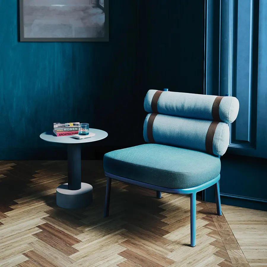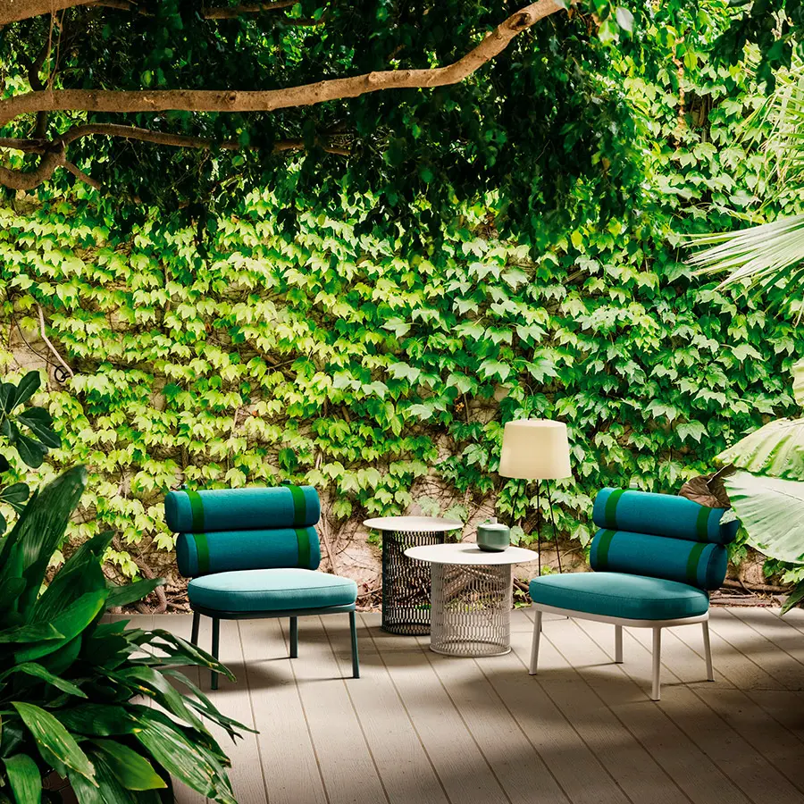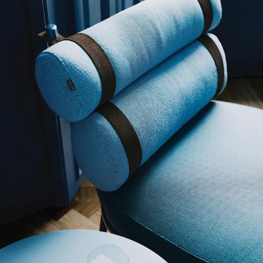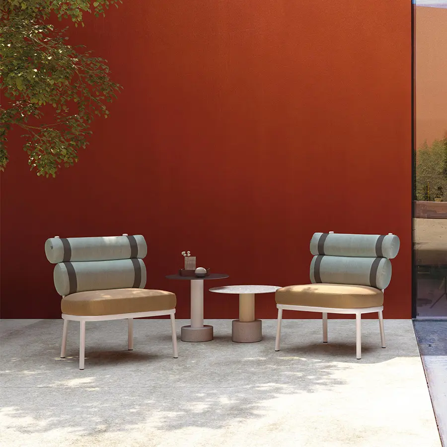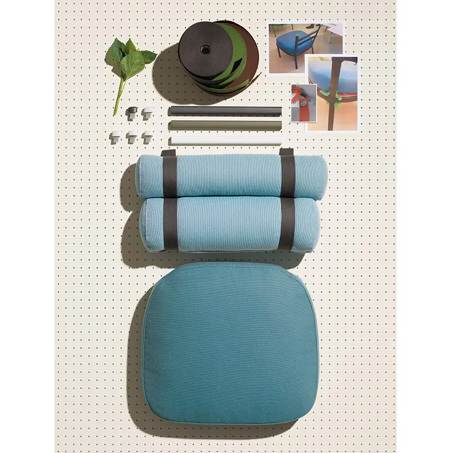 Este sillón transforma el respaldo convencional en dos cilindros unidos por tiras de color. La sencilla estructura de aluminio enmarca a los protagonistas de esta creación: sus cojines. Las tiras se unen a la estructura principal por medio de dos espigas que pueden quitarse con facilidad, permitiendo al usuario retirar los cojines y guardarlos durante el invierno. Un microtejido semitransparente sostiene el cojín del asiento.