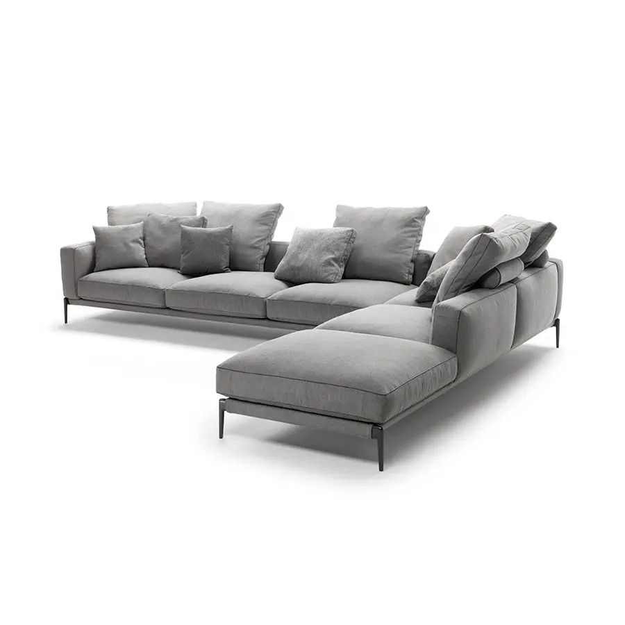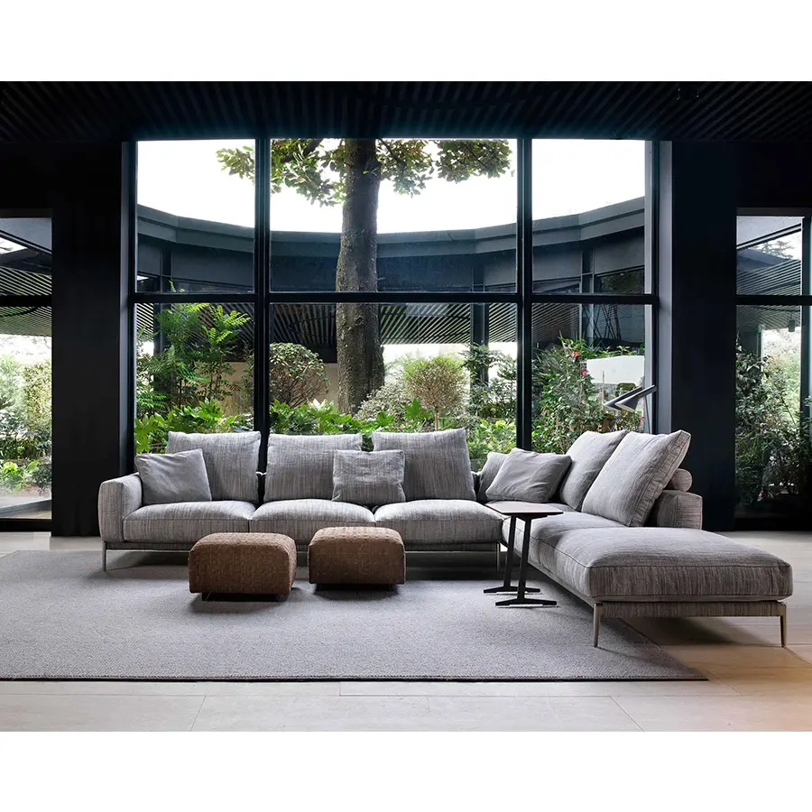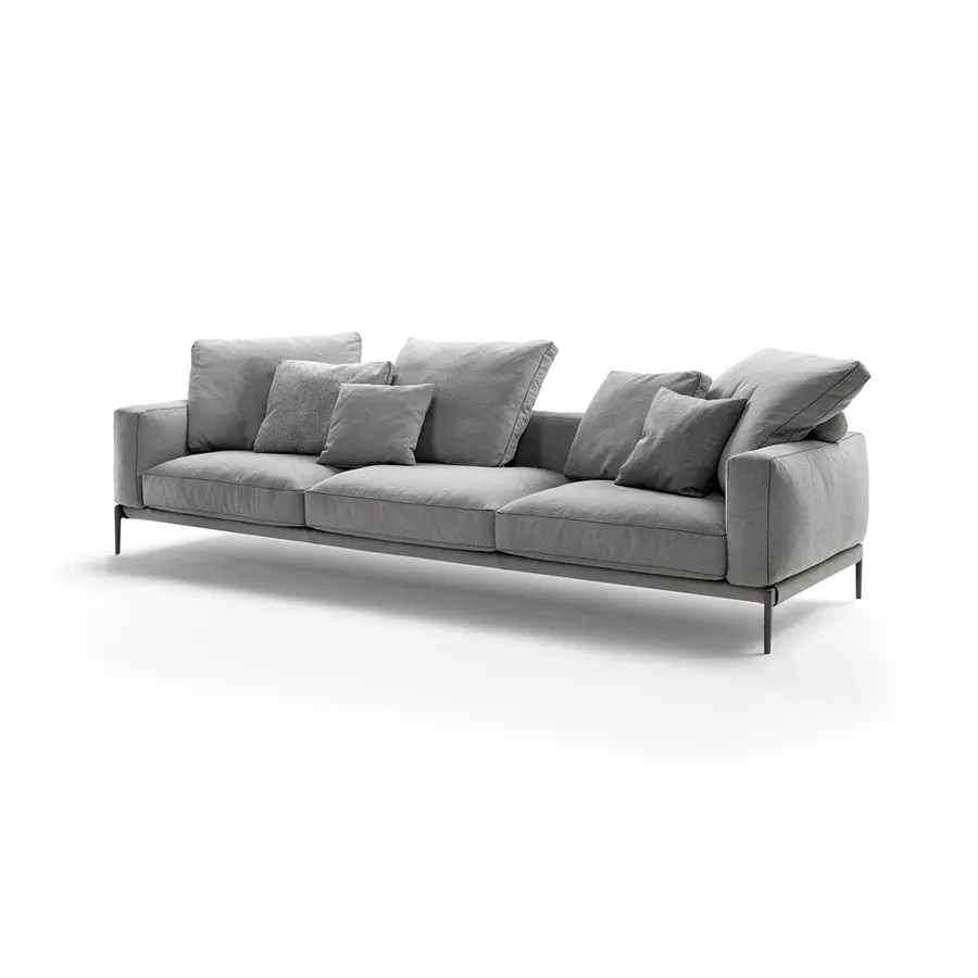 Alzado del suelo por pies cónicos de aluminio fundido a presión, el sofá Romeo se caracteriza por una línea estética ligera, compuesta de proporciones y detalles que atestiguan el savoir-faire de la sastrería de la empresa, como el fino inserto de grosgrain que contornea todas las costuras y subraya la armonía de las formas. Gracias a la perfecta inclinación del asiento y al generoso acolchado de los cojines, el sofá Romeo confirma la vocación de la empresa de combinar la sobriedad y la elegancia con un alto nivel de confort. Romeo es un sistema de asientos que destaca por su gran versatilidad, que le permite vestir con facilidad todos los tejidos y pieles de la colección Flexform, adquiriendo cada vez una personalidad diferente. El sofá Romeo es, por lo tanto, adecuado para decorar cualquier espacio, desde contextos caracterizados por un gusto minimalista hasta estancias de estilo más clásico.