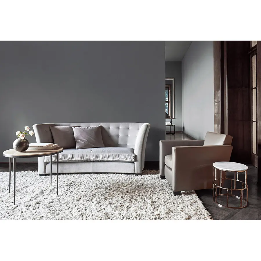 Romy es una mesa de centro elegante, caracterizada por una estructura esbelta a la vez que refinada de metal bronceado que se combina con un tablero de mármol travertino, un material noble muy utilizado por los etruscos gracias a sus excepcionales propiedades de resistencia combinadas con la belleza de su color. Pequeña pero preciosa, la mesa de centro Romy se puede combinar fácilmente con todos los asientos de la colección Flexform Mood.