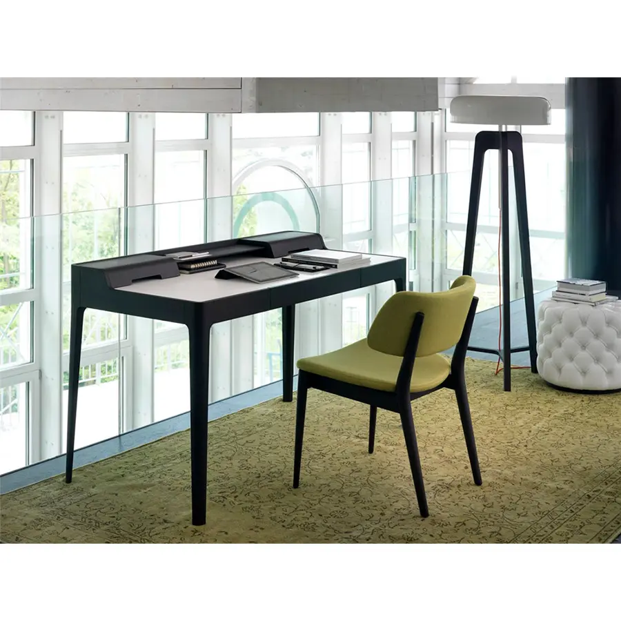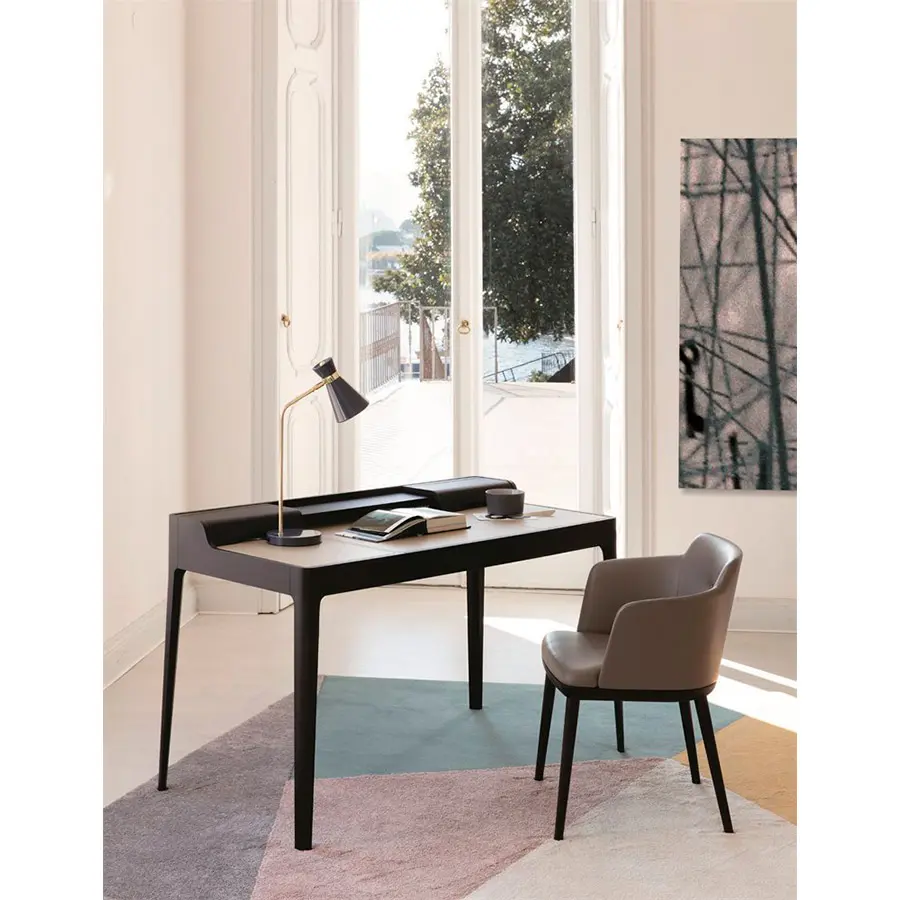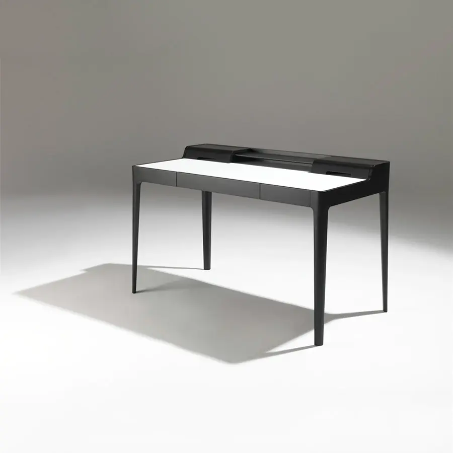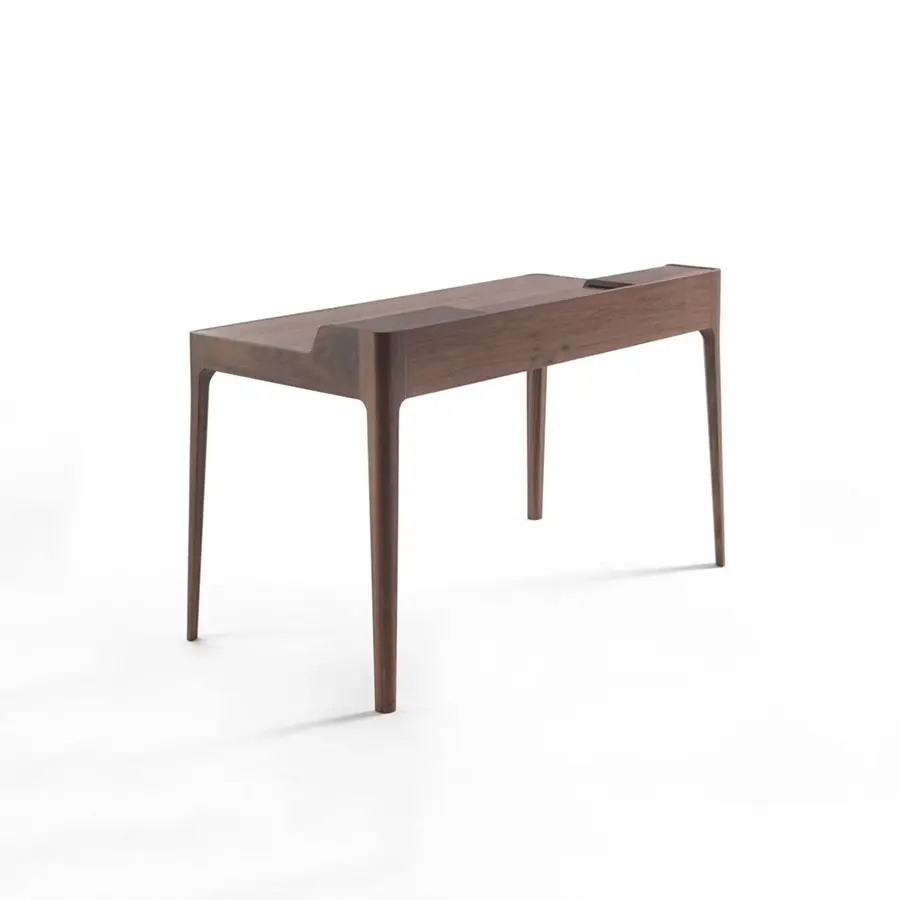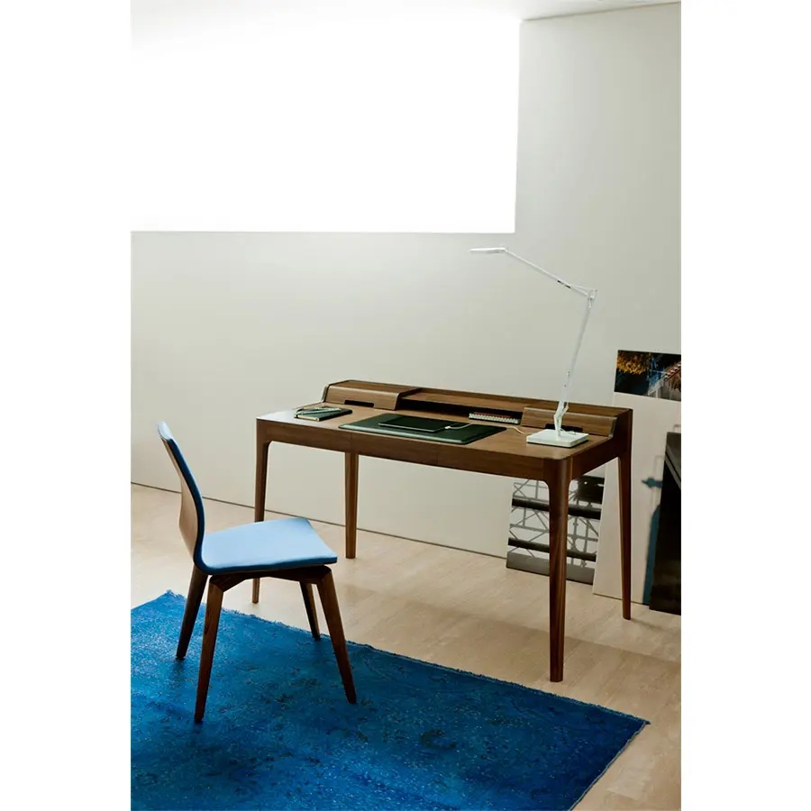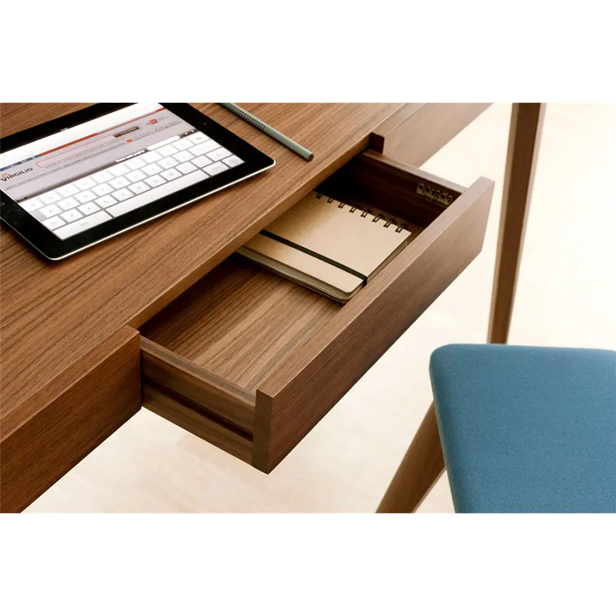 Escritorio con cajón en nogal canaletta macizo, portaobjetos y pasacables. Almohadilla o tapa en cuoietto.