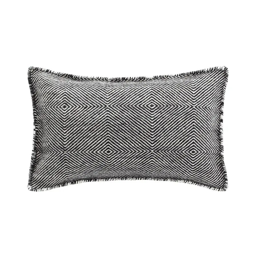 Este es el cojín de formato apaisado de la colección Sail, confeccionado con un tejido de hipnóticos rombos que se elabora a mano por artesanos de India empleando la técnica Dhurrie, 100% lana virgen y telares manuales. Por su diseño, supone toda una revisión contemporánea de la estética de los tradicionales tapetes y alfombras Dhurrie.