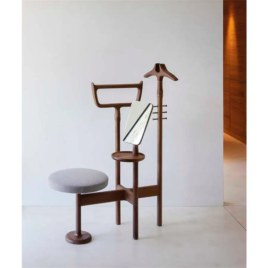 Galán de noche en nogal canaletta macizo con perchas, platillo con espejo orientables y taburete tapizado en las telas de la colección. Todos los elementos se pueden cambiar entre ellos, excepto el taburete.