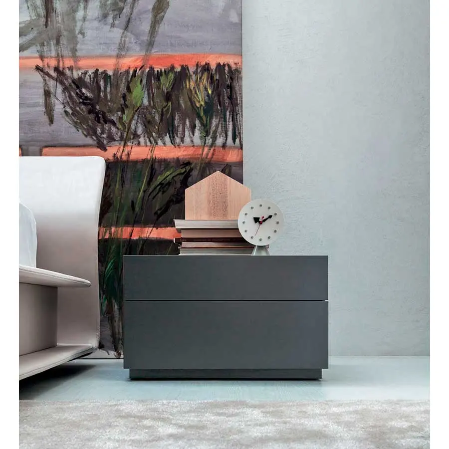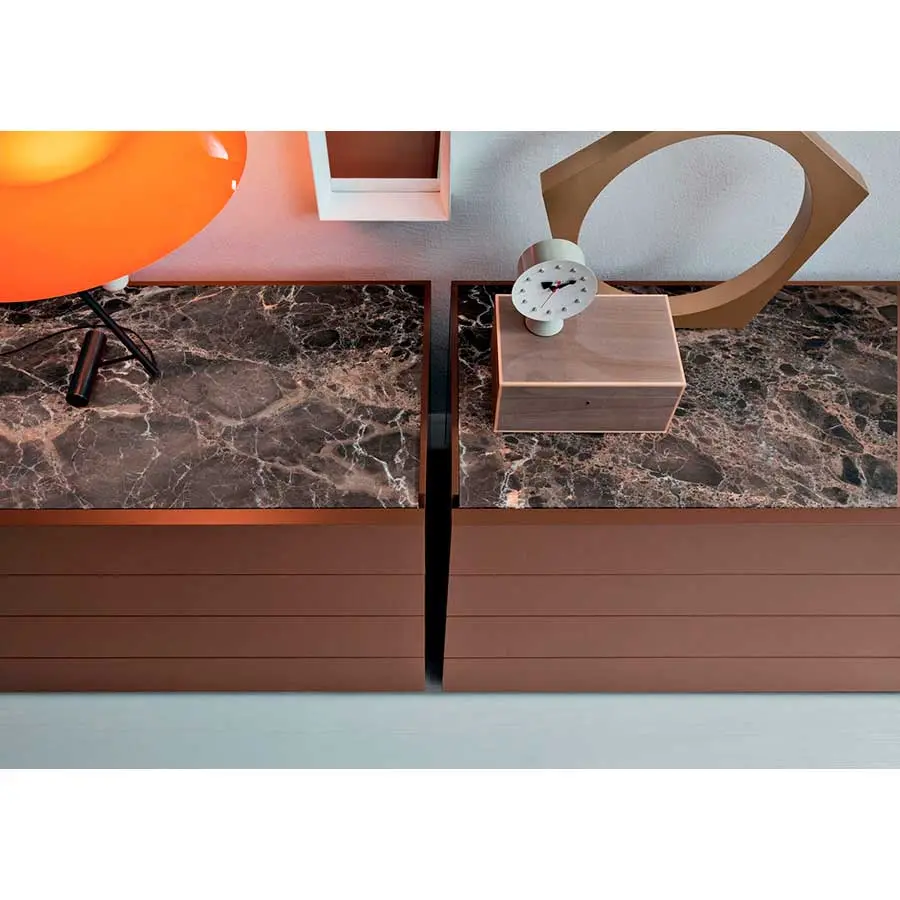 Polifacética familia de contenedores noche siempre en madera de diseño sobrio y elegante, caracterizados por una gran variedad de acabados que hacen de 606 un producto versátil a utilizarse con cualquier solución de decoración. Serie de cajoneras caracterizadas por el frente sin tirador y el sobre de cristal acidificado coloreado o mármol, disponible con base en dos versiones, tradicional apoyada en el suelo o con base metálica, que acentúa sus líneas esbeltas. Los elementos laterales y los sobres de cristal acidificado en matices de color permiten realizar contrastes importantes entre estructura y cajones, o an alternativa estructuras monocromáticas.