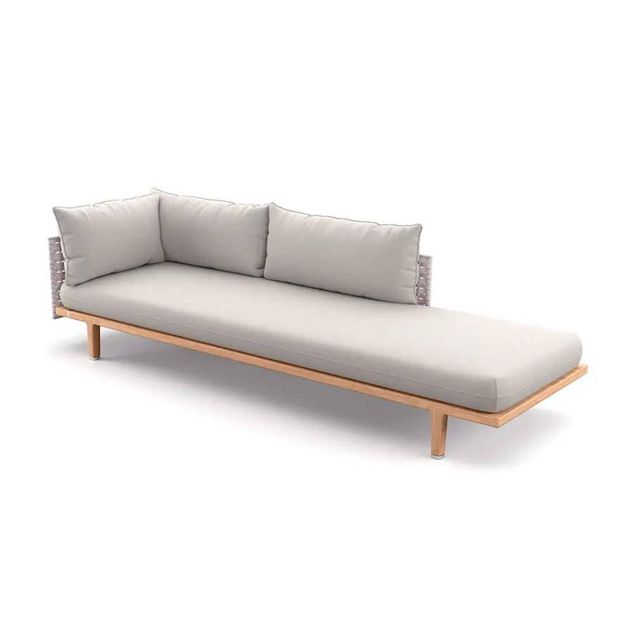 SEALINE es un sistema de muebles para exterior compacto y flexible que comprende módulos de 2 y 3 plazas, amplios módulos de sofás cama, mesas de café de teca con tableros de piedra o mármol y un banco de teca. Todas las estructuras son de sólida teca de primera calidad, con soporte Sling para mayor comodidad. Los respaldos y los apoyabrazos laterales, tejidos o en cabo náutico impermeable italiano o en Fibra DEDON extra ancha, evocan la tradición DEDON además de crear un elegante apoyo para las almohadas y los cojines. Estos presentan unas refinadas costuras dobles y se colocan sobre una sofisticada construcción de cojines, que aseguran una comodidad excepcional. SEALINE se monta usando conectores de aluminio fundido de alta calidad de fácil mantenimiento y larga duración.