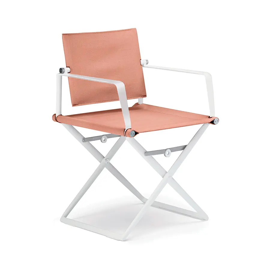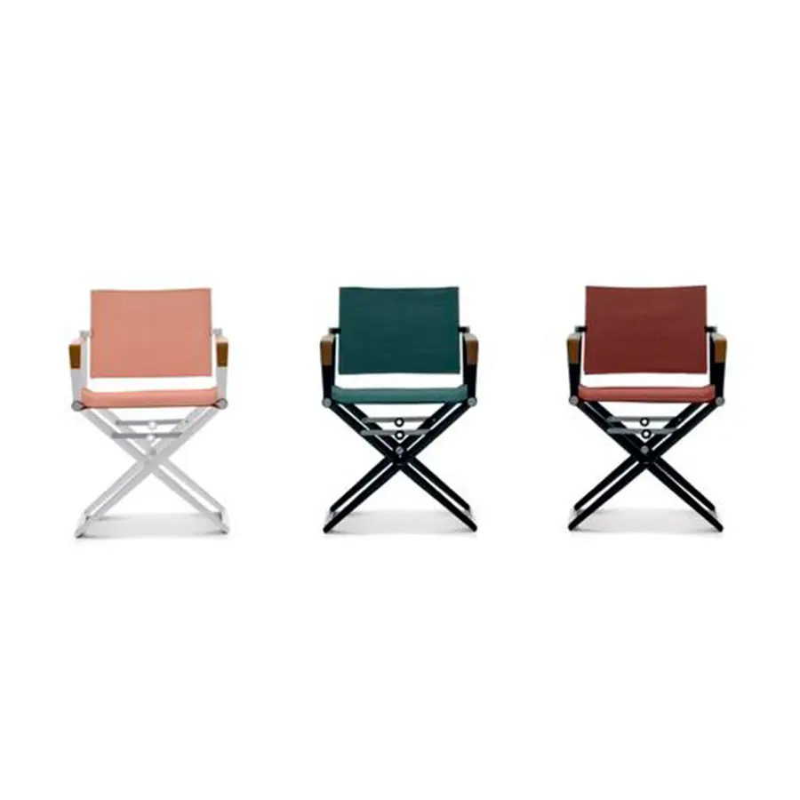 Disponible con reposabrazos con o sin teca, estructura en aluminio blanco o negro e infinidad de acabados textiles que se han incorporado a la colección.