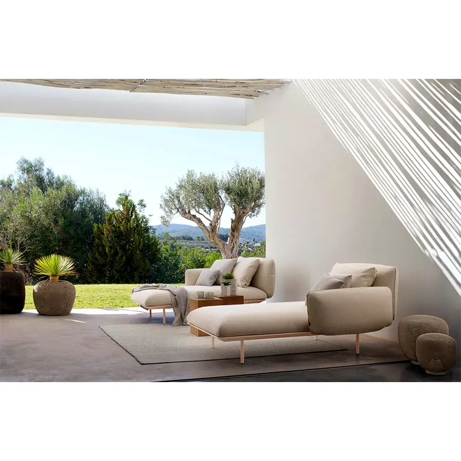 Acurrúcate y relájate en la Senja meridienne. El abundante relleno les da una forma agradable y orgánica, rematada con un ribete. La estructura de aluminio con revestimiento en polvo está disponible en los colores linen y wengé,y las patas en teca o aluminio a juego. Con las estructuras en dos colores y más de 100 telas, las posibilidades son numerosas para crear un meridienne que se adapte perfectamente a su entorno exterior.